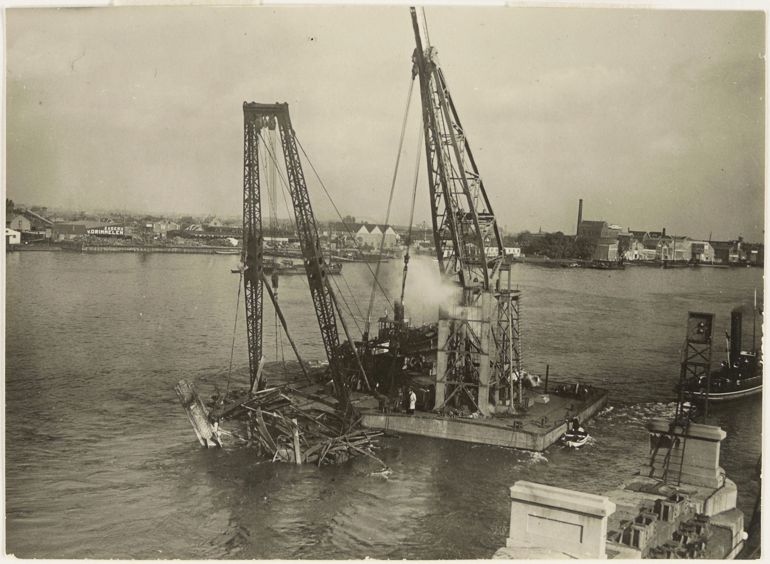 Herstel van de in mei 1945 door de Duitsers vernielde spoorbrug over de Oude Maas.