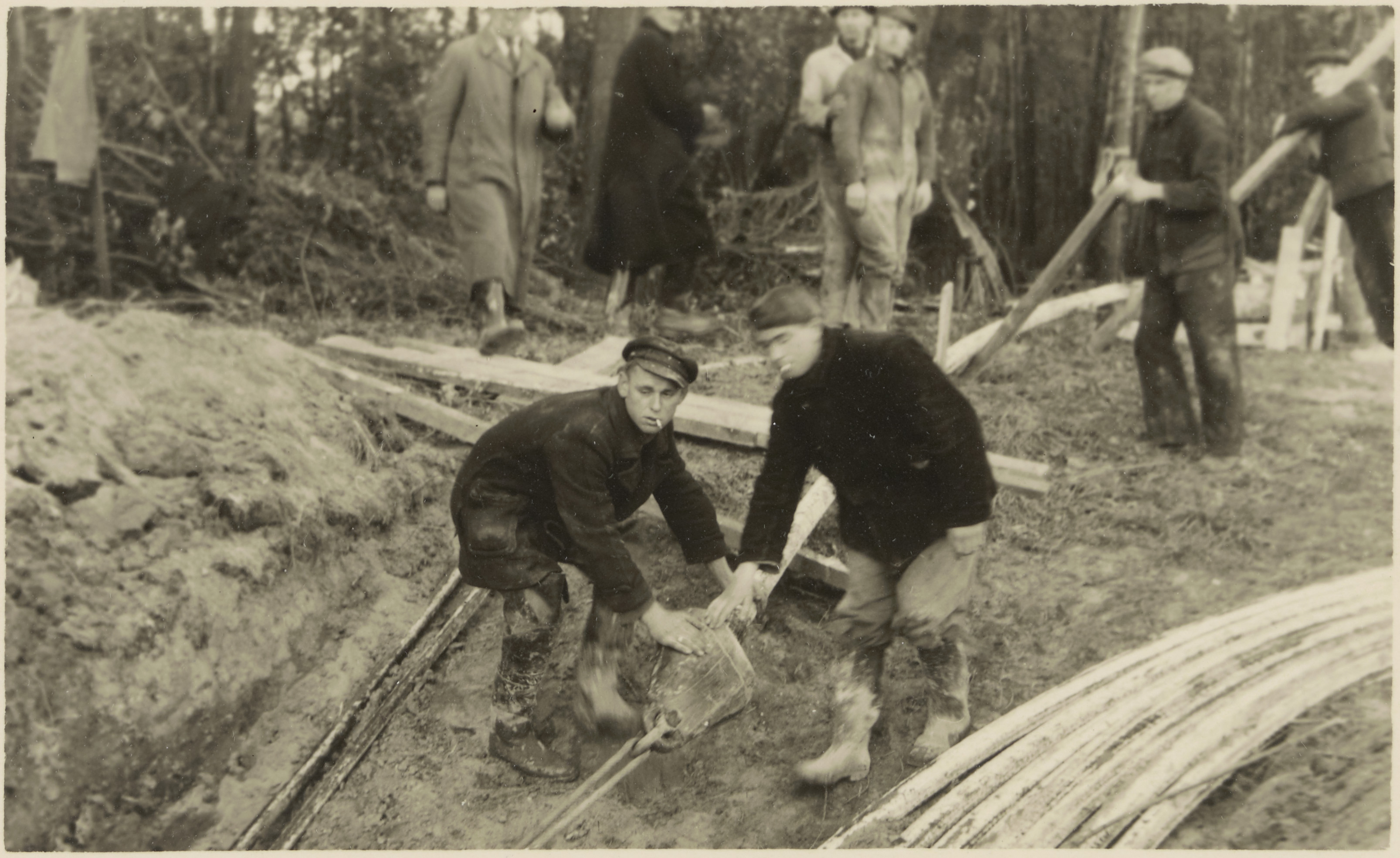 - Elektriciteitskabels worden vanaf het Groothoofd onder de Oude Maas getrokken. Deze arbeiders staan op de Zwijndrechtse oever.