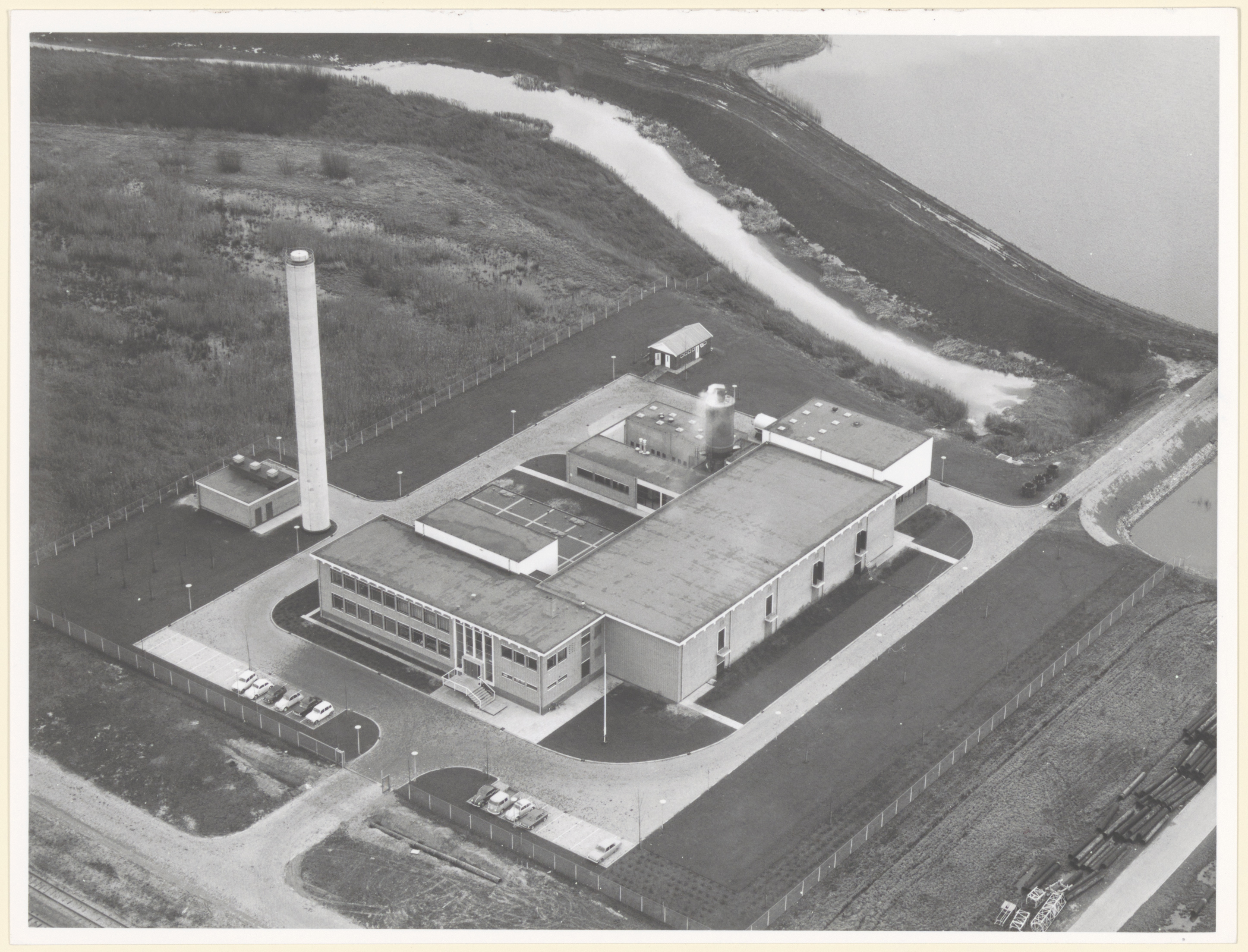 Het pompstation van het waterleidingbedrijf aan de Baanhoekweg, vanuit het noorden gezien; linksonder de Baanhoekweg en het industriespoorlijntje, rechtsboven het spaarbekken.