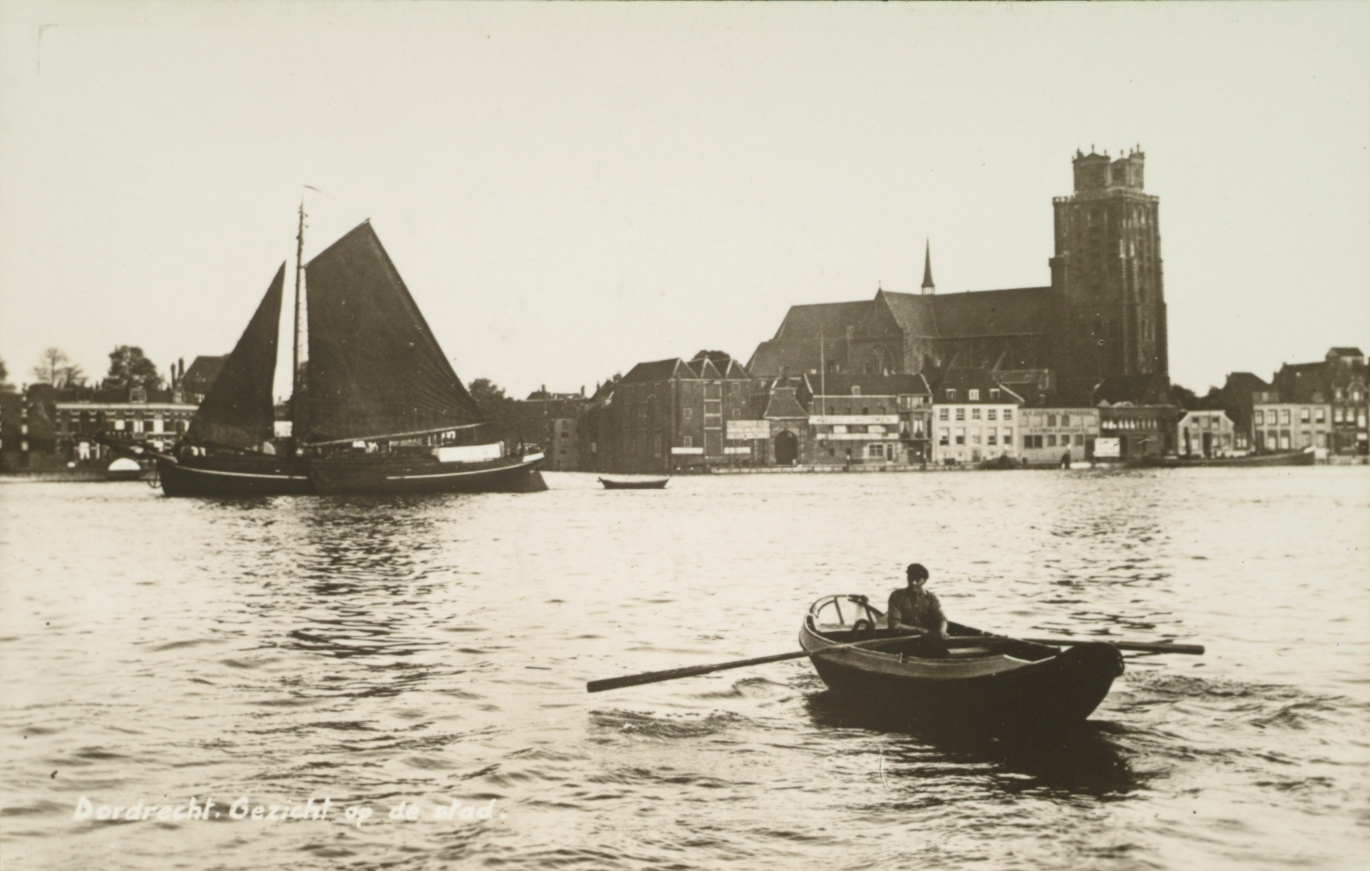 Grens Beneden Merwede en Oude Maas. Grote Kerk, Hooikade en rechts, direct naast het zeilschip, de Leuvehaven.