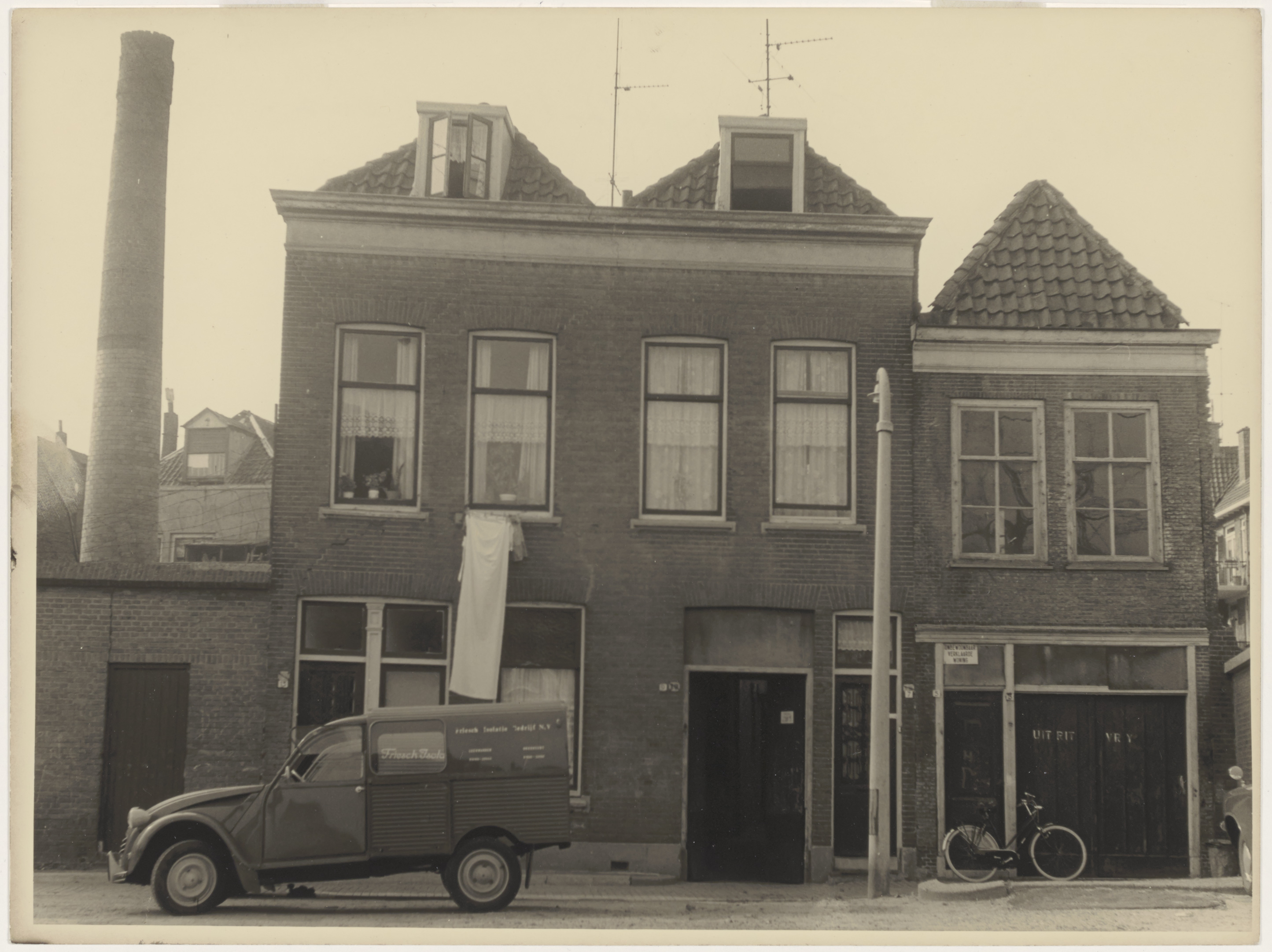 Bedrijfswagen van het Friesch Isolatie Bedrijf bij het pakhuis in de Wijngaardstraat. …