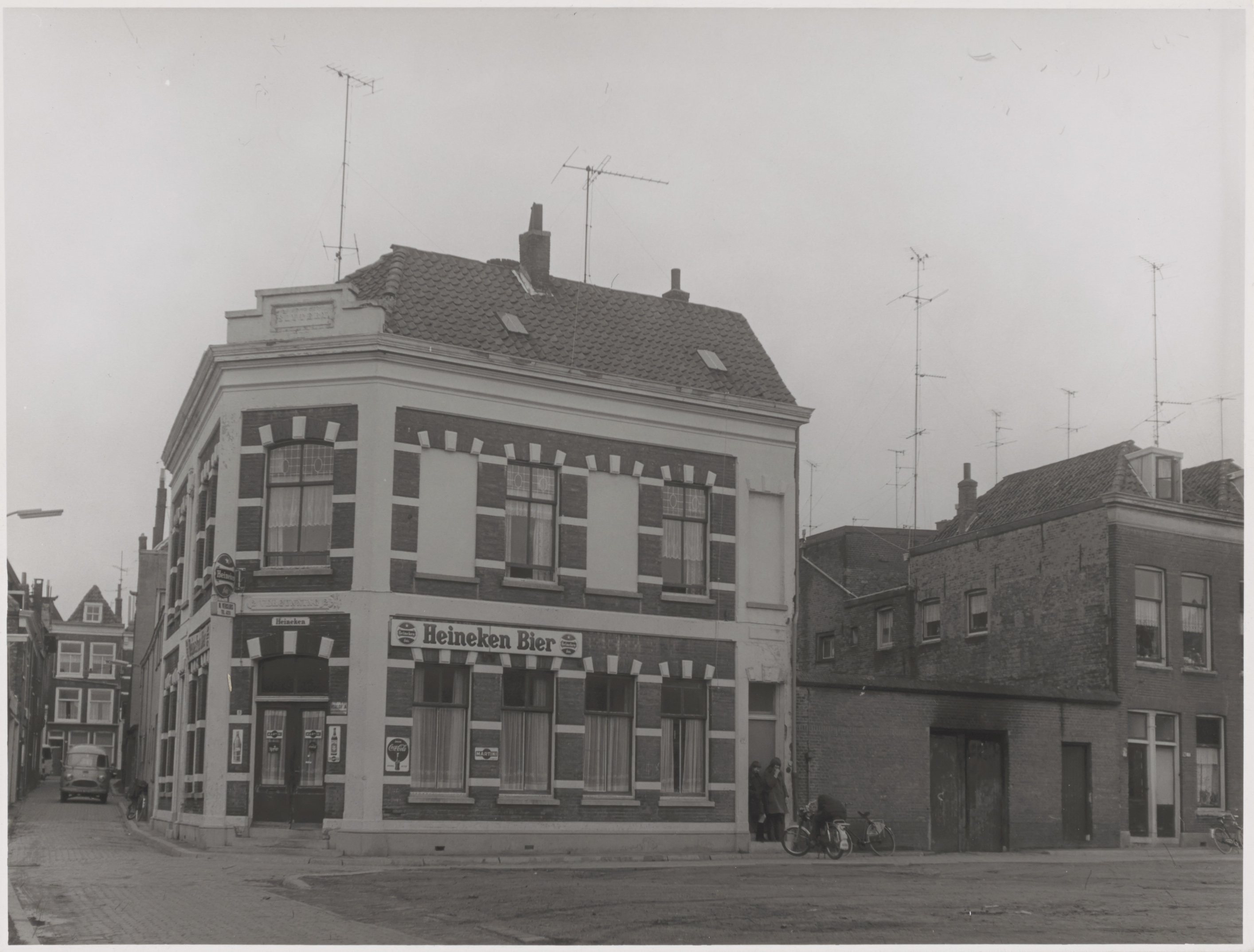 Café Versluis in de Wijngaardstraat op de hoek van de Nieuwkerkstraat (links), die in …