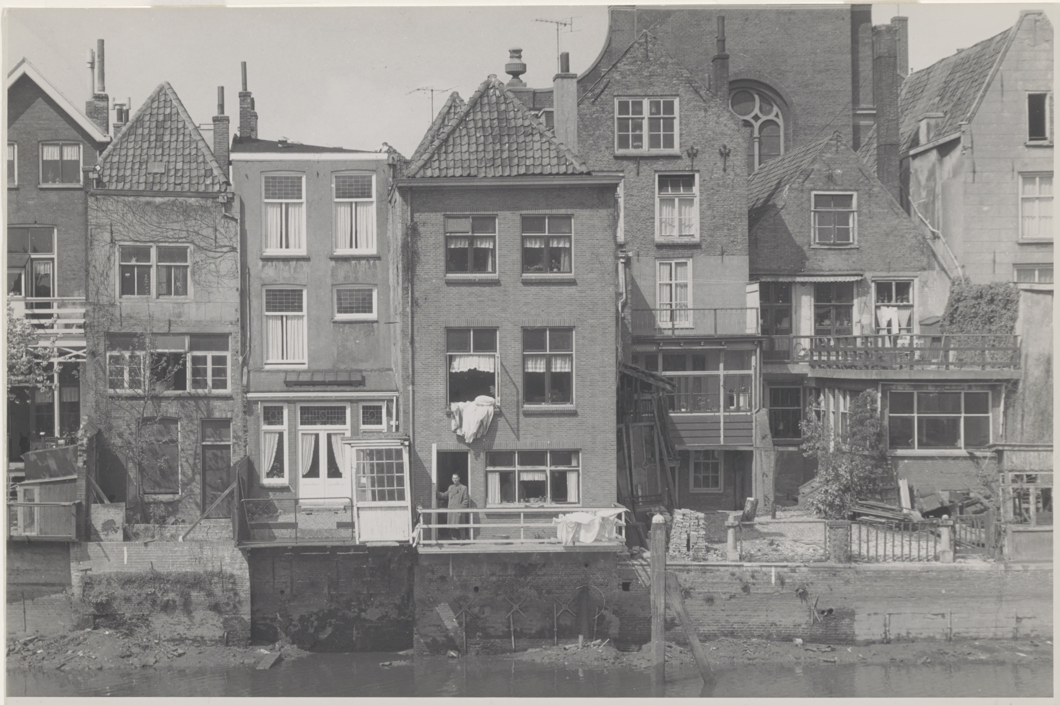 Achtergevels van panden in de Wijnstraat tegenover de Bonifatiuskerk, gezien vanaf de Taankade over de Wijnhaven.