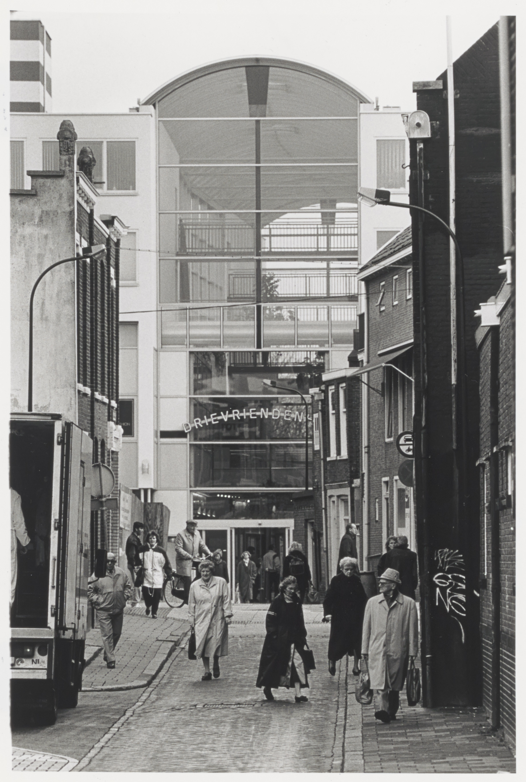 Zicht op de (zij)entree tot de Drievriendenhof vanuit de Lenghengang. Rechts vooraan de zijmuur van de Lenghenhof.