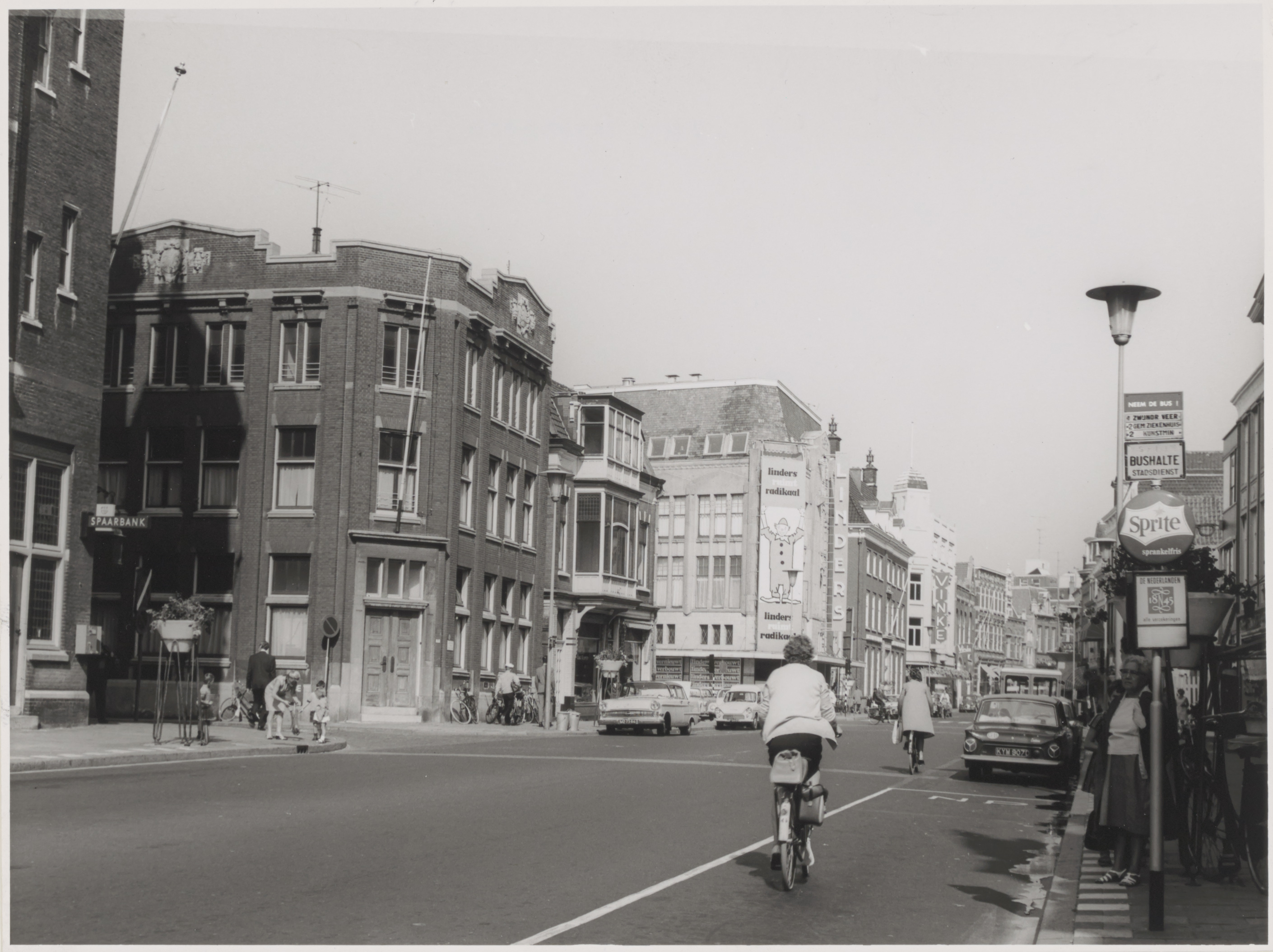 - Bagijnhof richting Visstraat. V.l.n.r. het postkantoor, de Merwedebank, warenhuis Linders en damesmode Vinke.
