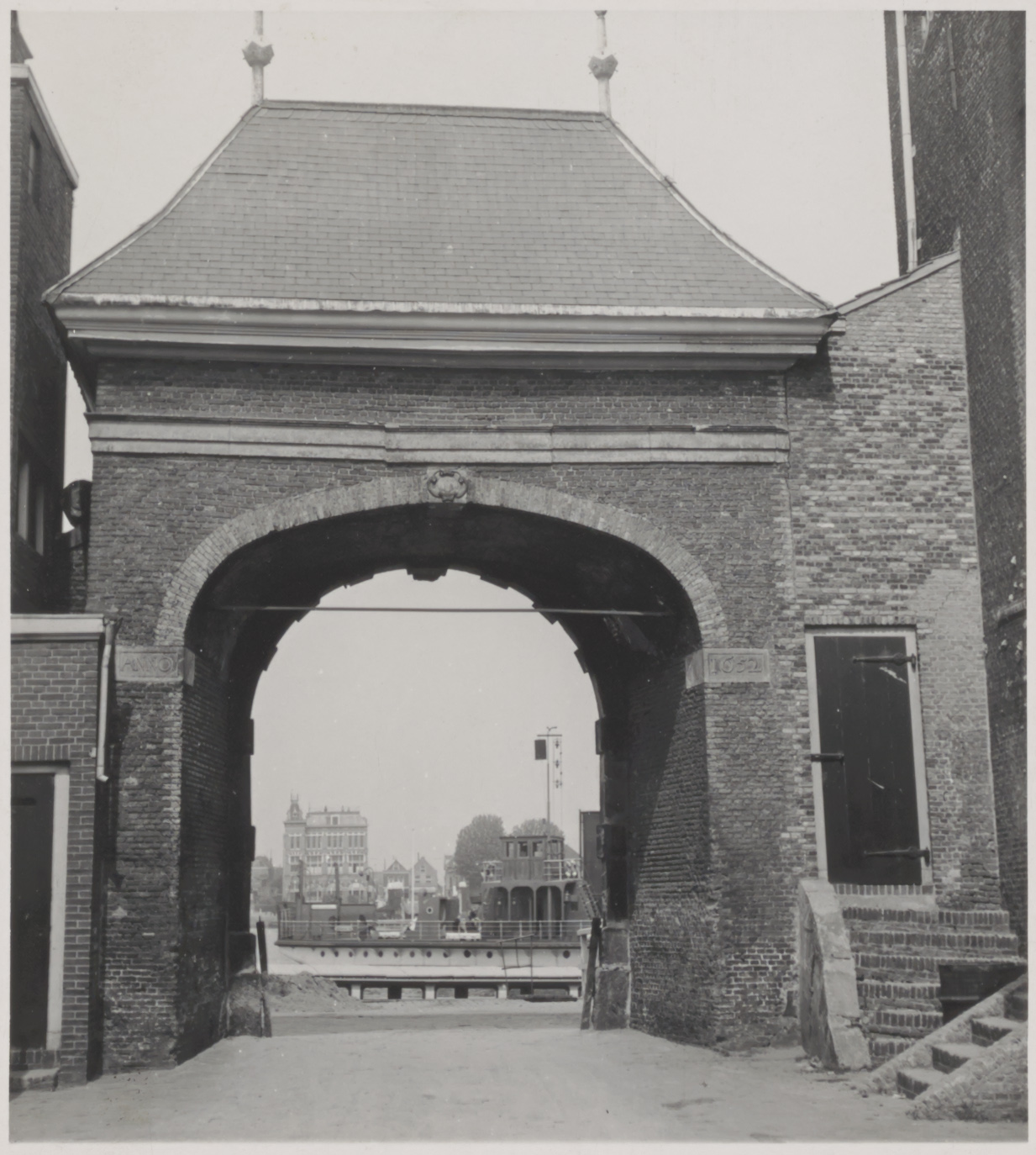 - Hotel Het Witte Paard in Zwijndrecht en een veerboot gezien door de Catrijnepoort.