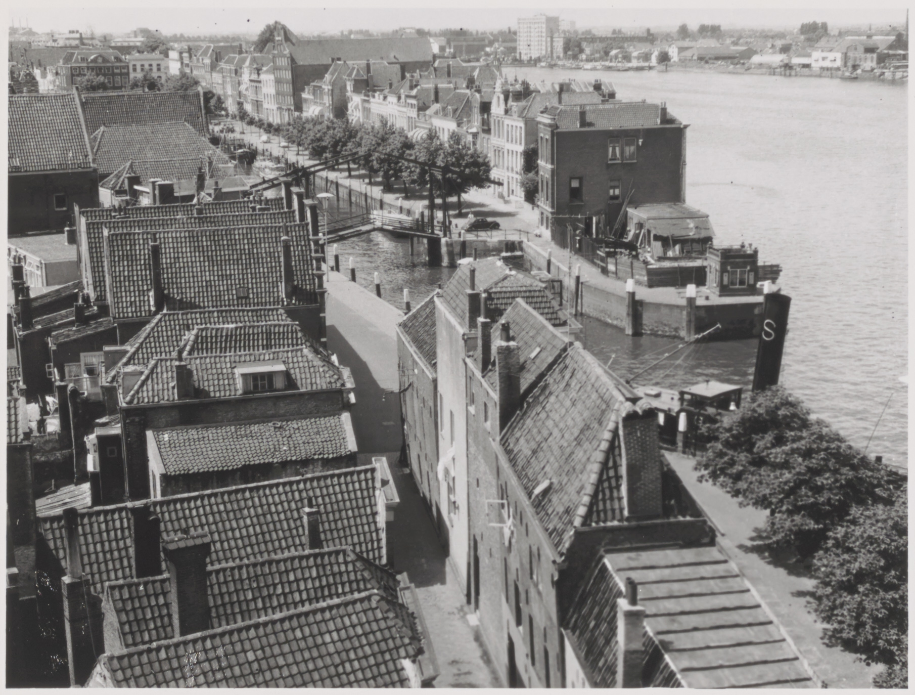 Zicht op de Wolwevershaven en met op de kop het brugwachtershuisje voor bescherming van de brugwachter, rechts de rivier de Maas