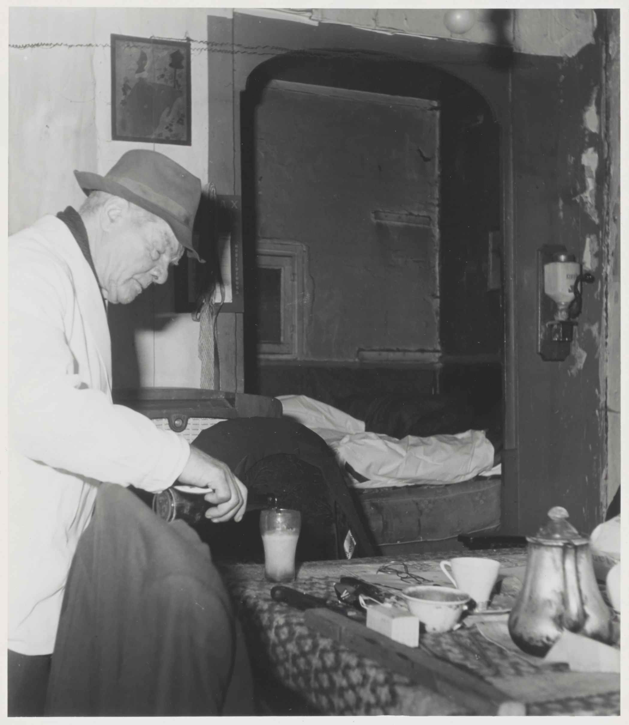 Interieur met bedstee en koffiemolen.