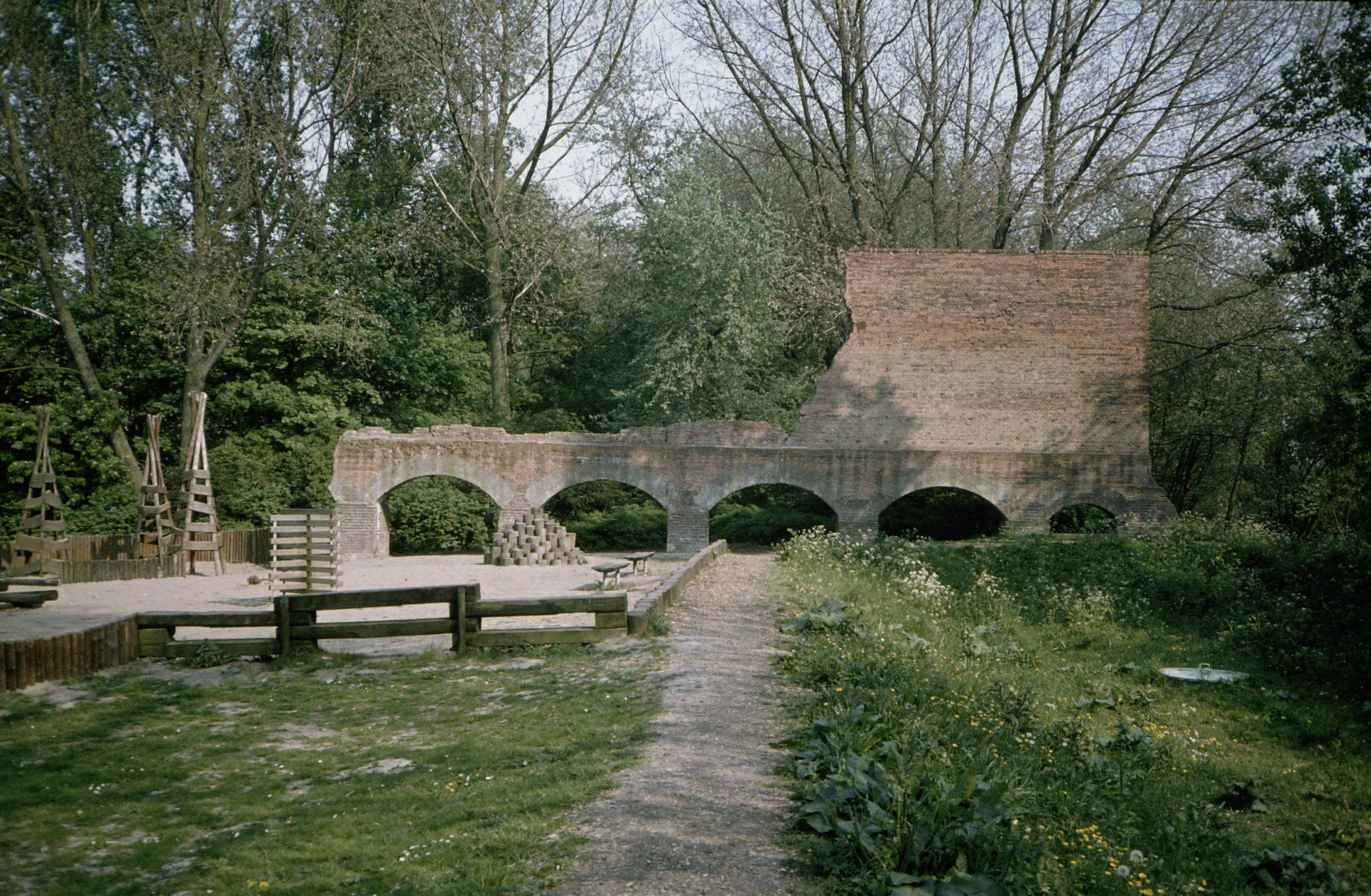 - Schietmuur of kogelvanger in het Wantijpark. Ervoor ligt een terrein met zand waarop speeltoestellen staan.
