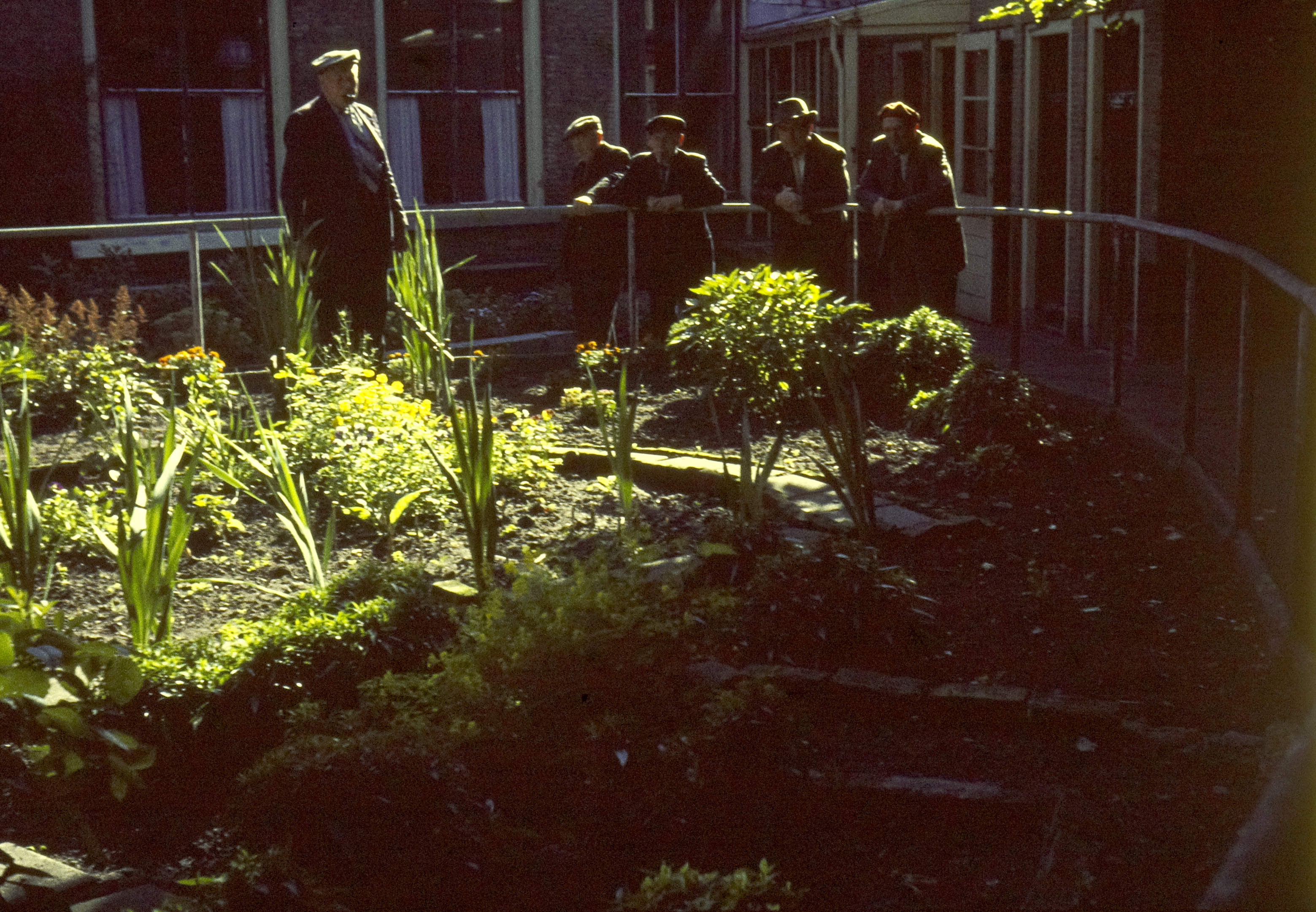 Bewoners van het oudemannenhuis in de tuin van het gebouw aan het Bagijnhof.