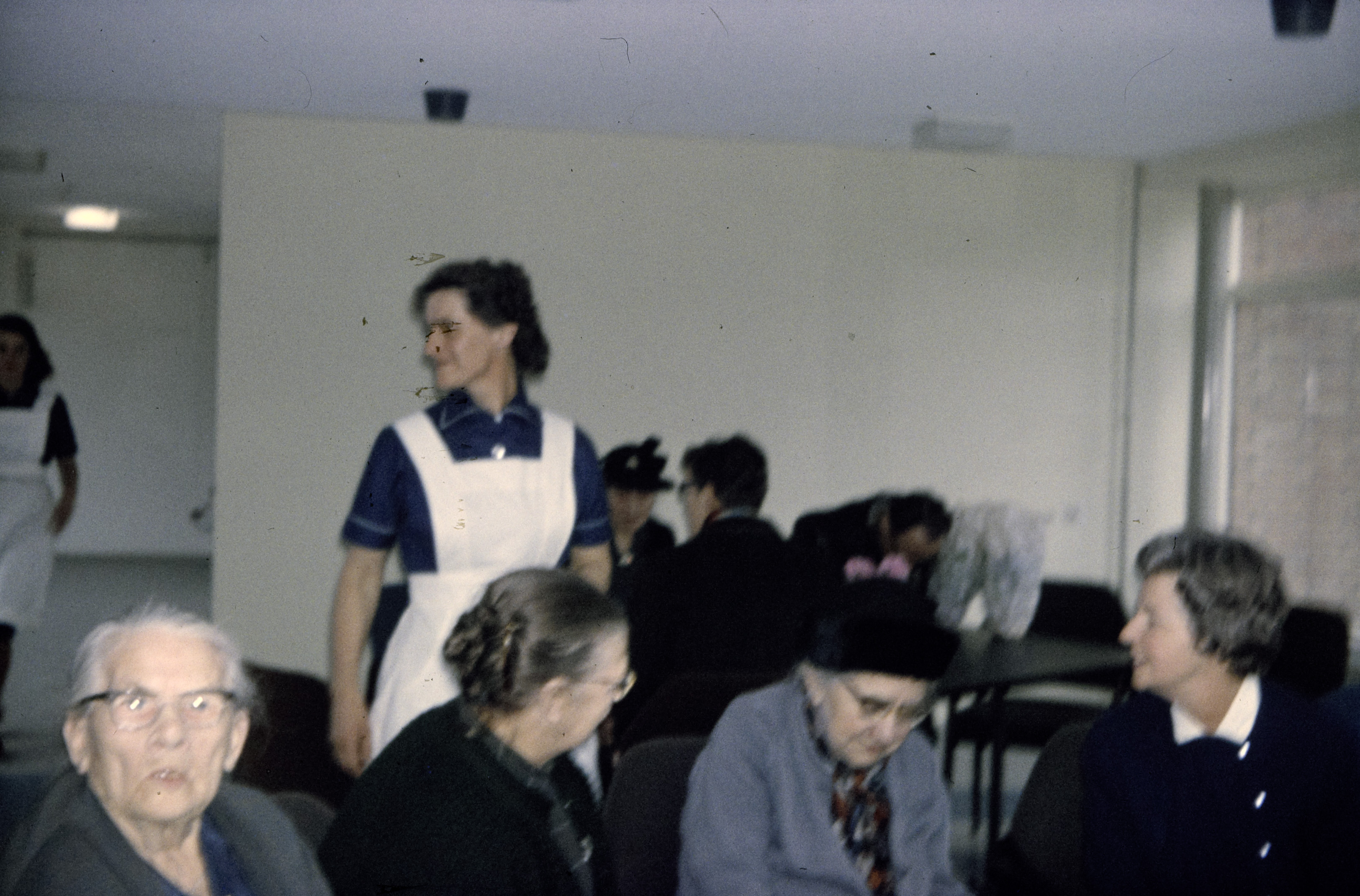 Enkele bewoners en verplegend personeel in bejaardentehuis Vijverhof in de Henri …
