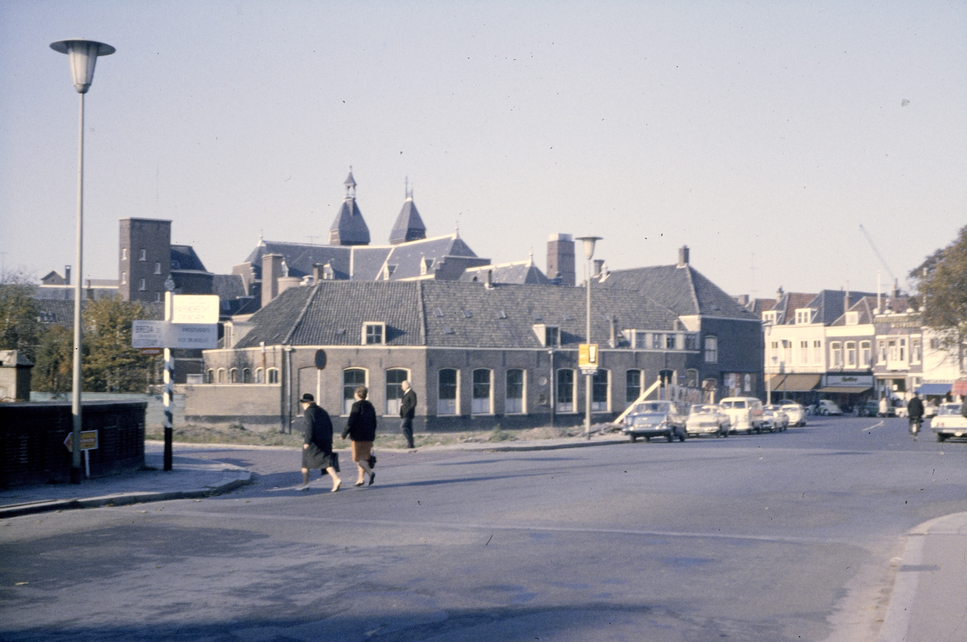- Het Bestedelingenhuis in het Achterom; de ingang is op het Bagijnhof. Het gebouw erachter is het prostkantoor. Gezien vanaf de Johan de Witbrug, over de Vest in de richting van de Johan de Wittstraat en het Bagijnhof.