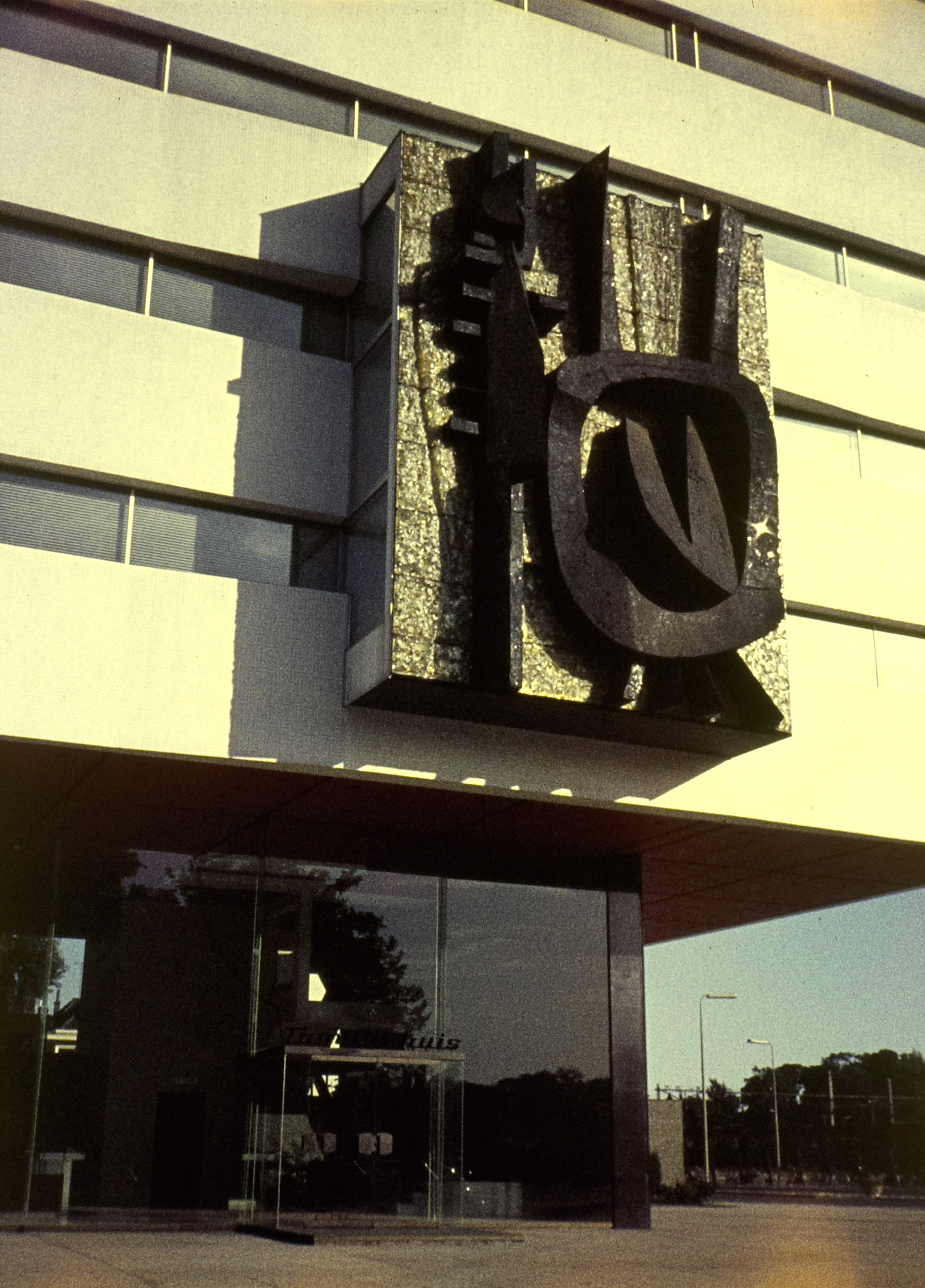 - Beeld van Joop van den Broek aan de gevel boven de ingang van het Tomadohuis op de Stationsweg, hoek Burgemeester de Raadtsingel.