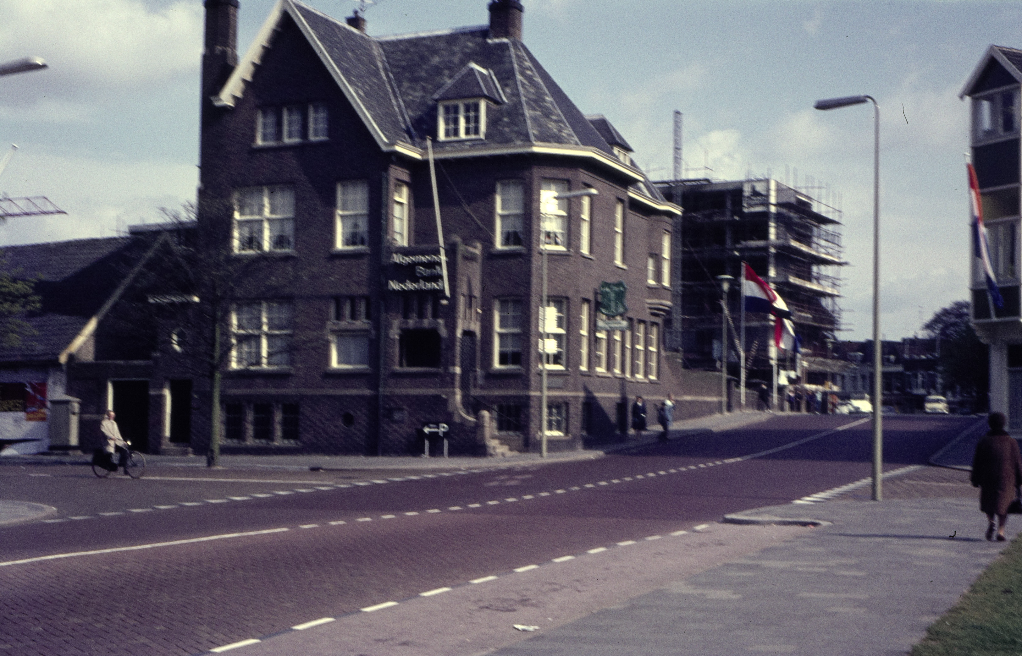 - bankgebouwen bruggen fietsers hotels sloopwerkzaamheden vlaggen(stokken) voetgangers