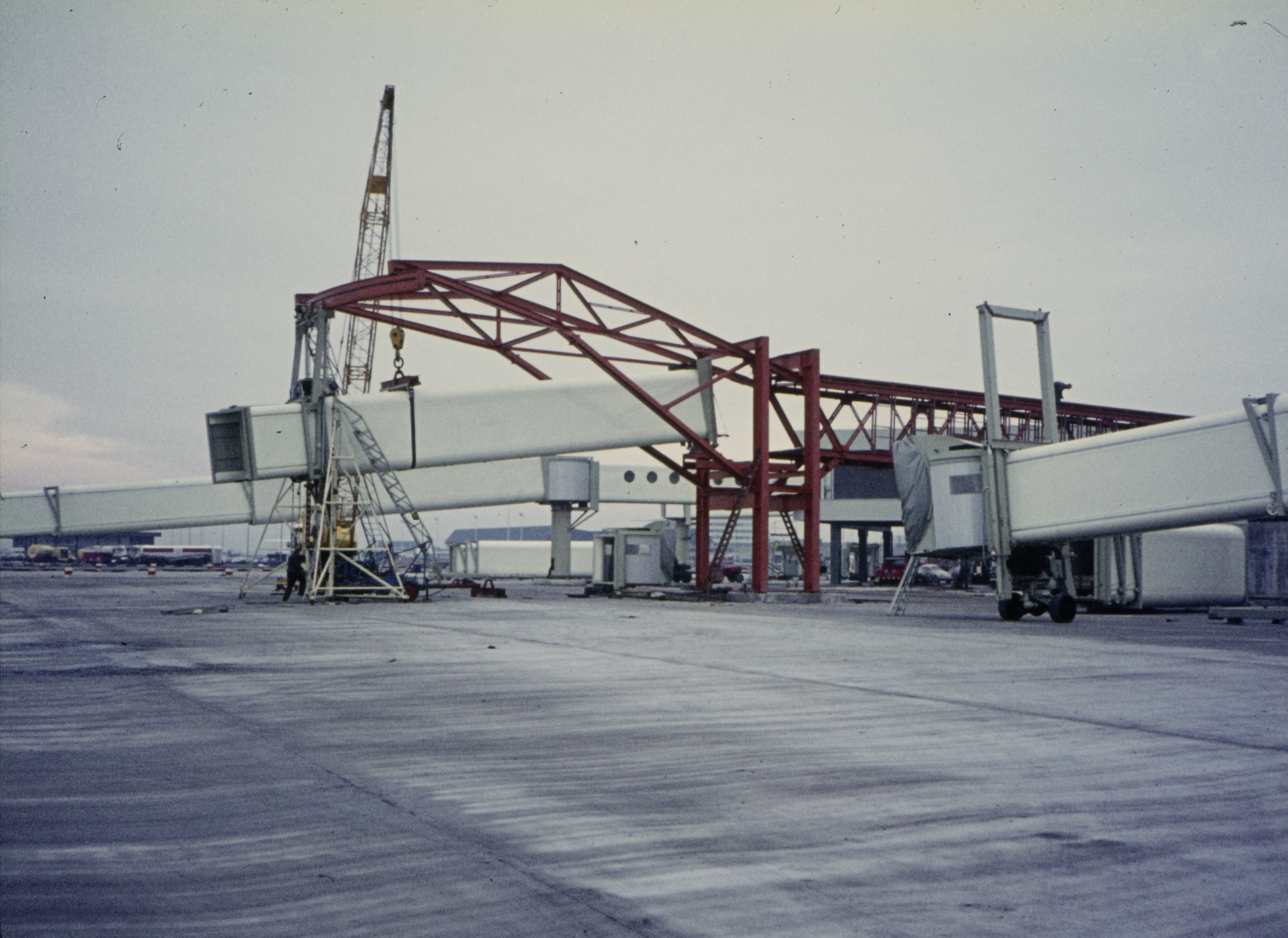 Bouw van een passagiersbrug van Grumman Avio Systems Corporation op een vliegveld in de VS.