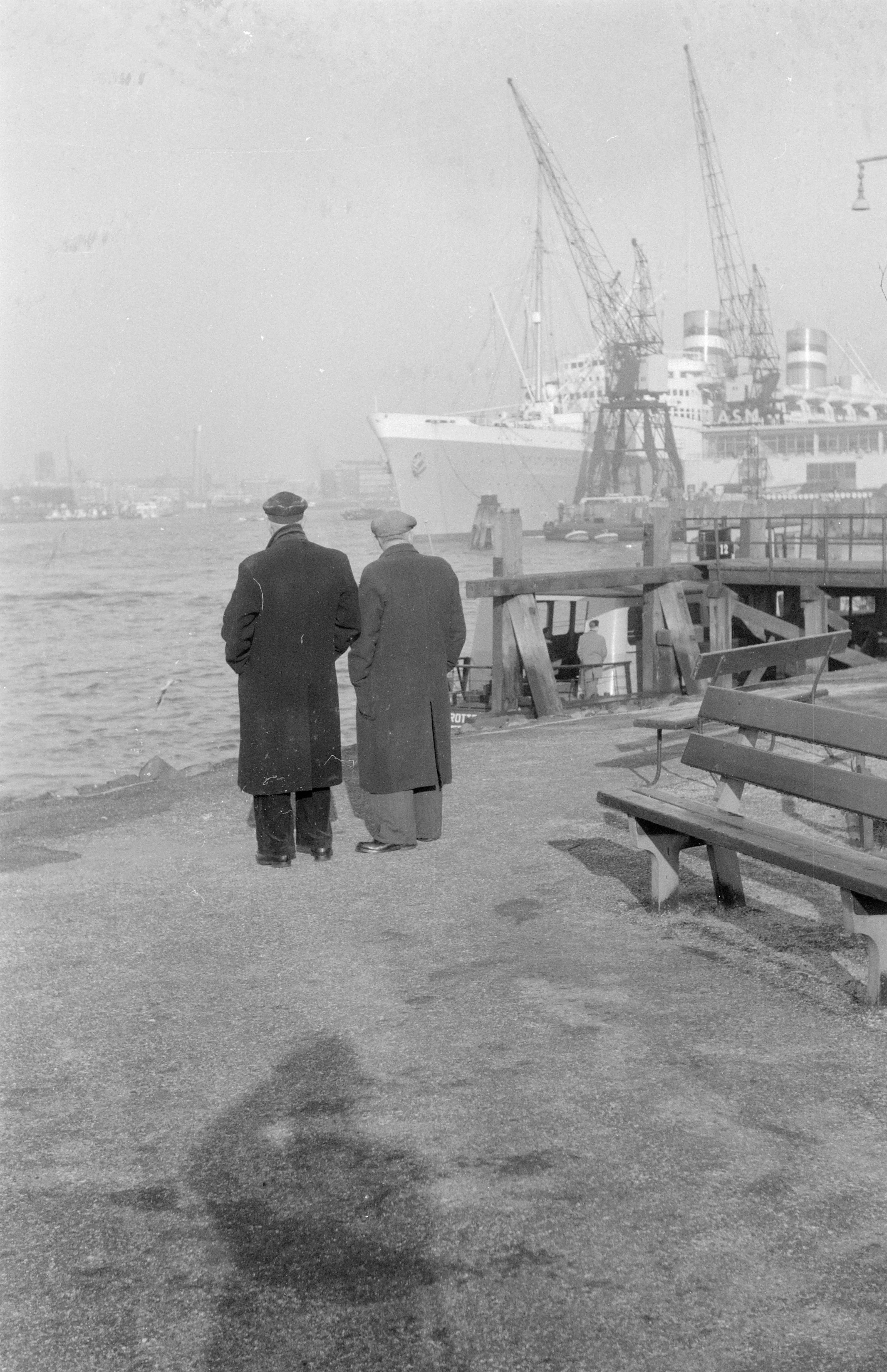 Oever van Katendrecht aan de Nieuwe Maas in Rotterdam, gezien naar de Willemskade en het passagiersschip Nieuw Amsterdam van de Holland-Amerika Lijn.