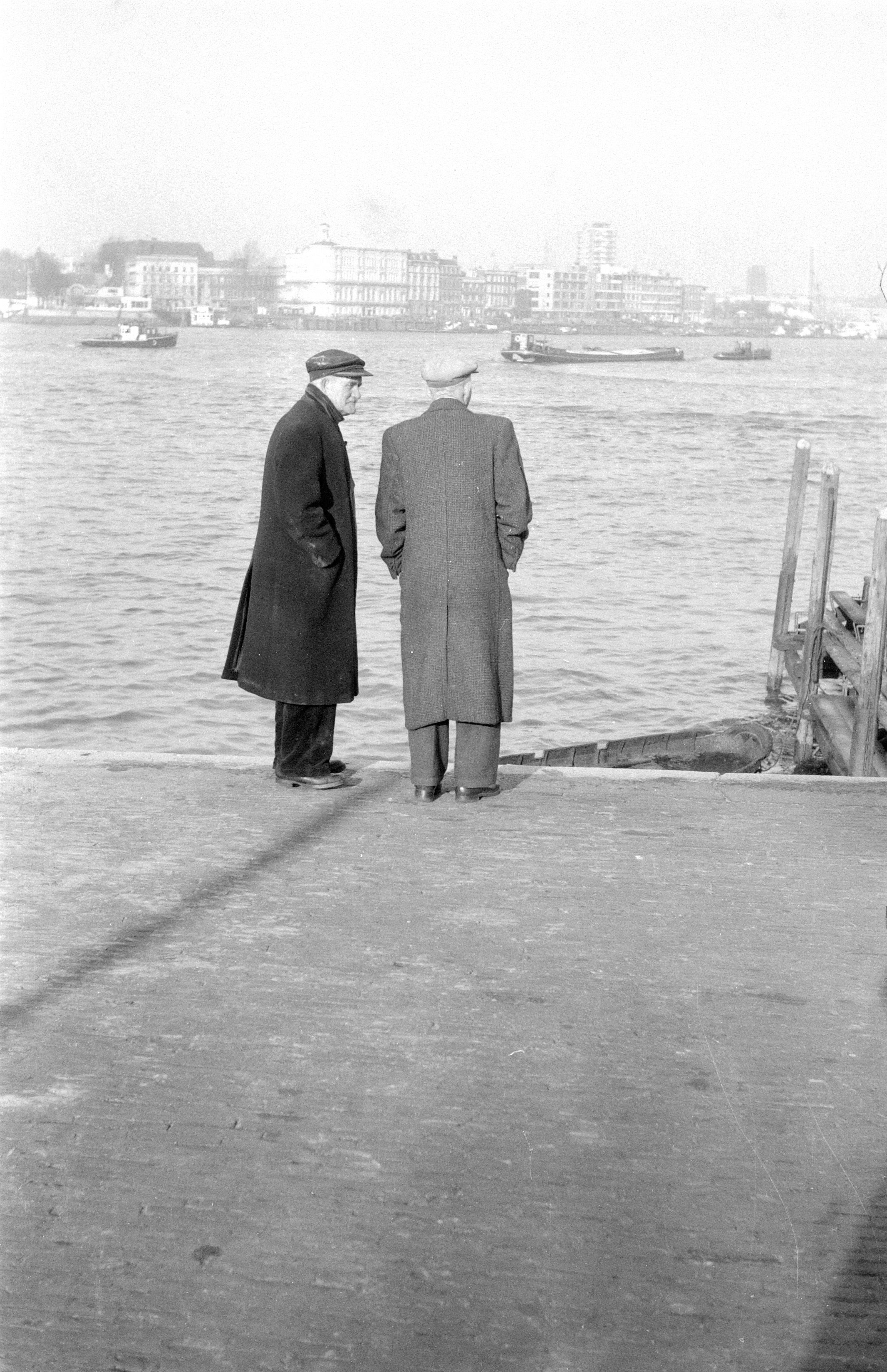 Rotterdam. Deze mannen staan op Katendrecht, waar nu het Buizenpark is, en kijken over de Nieuwe Maas naar de Willemskade. In het witte gebouw boven hun hoofden zit nu het wereldmuseum.