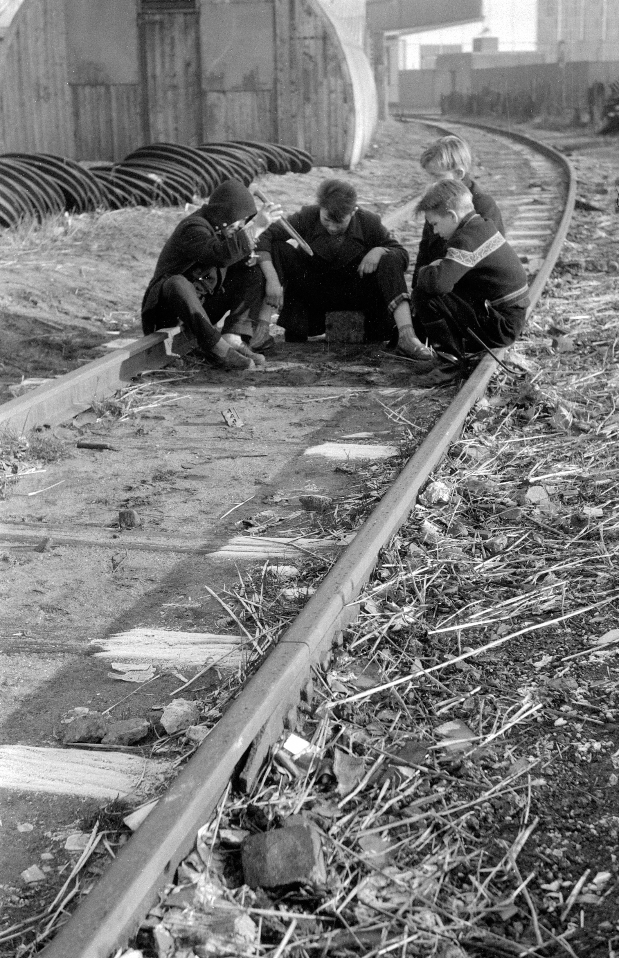 Groepje jeugd op het opslagterrein van machinefabriek Nemag BV, gelegen tussen de …