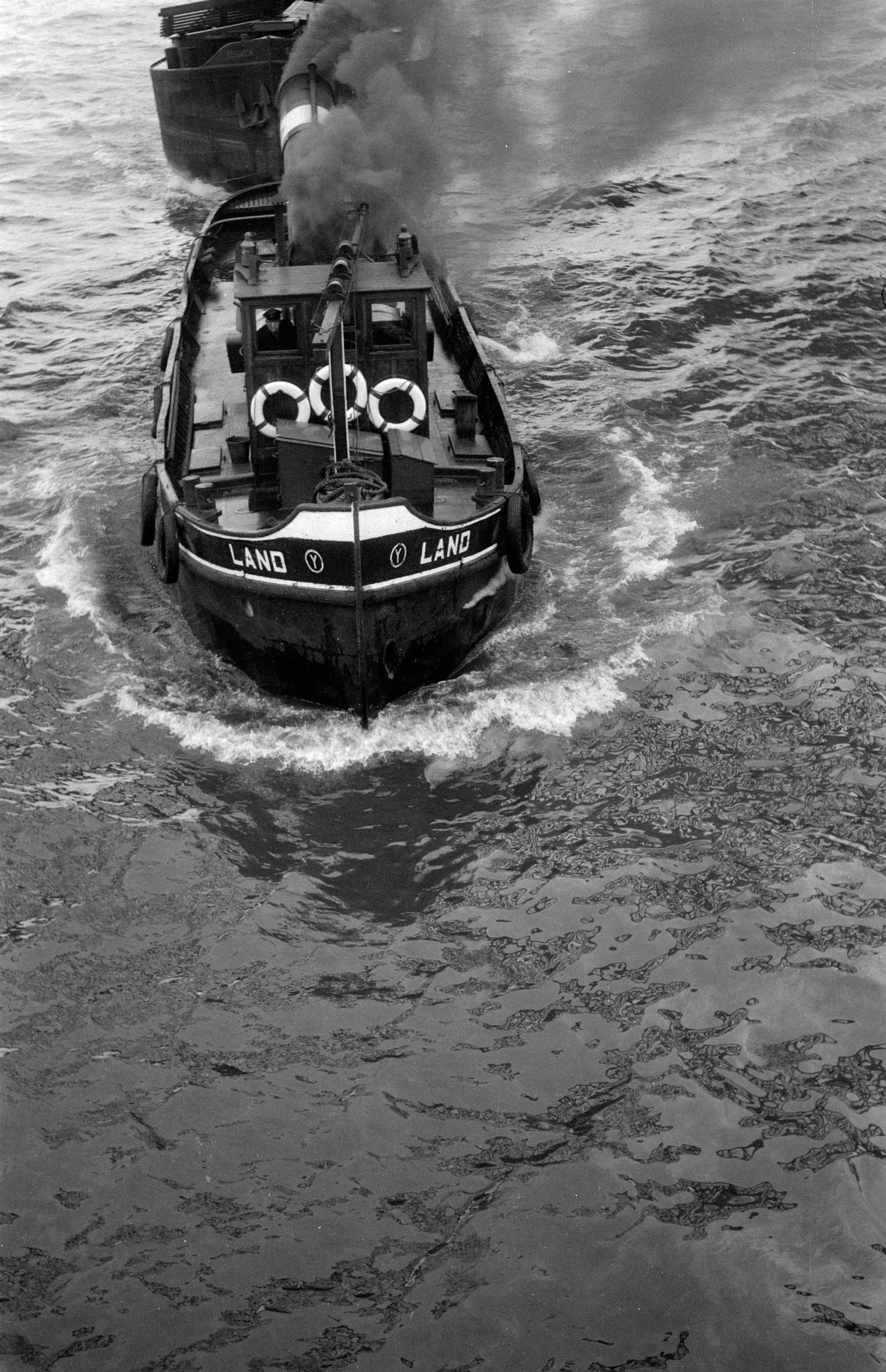 - Stoomsleepboot met neergrelaten schoortsteen sleept rijnaak.