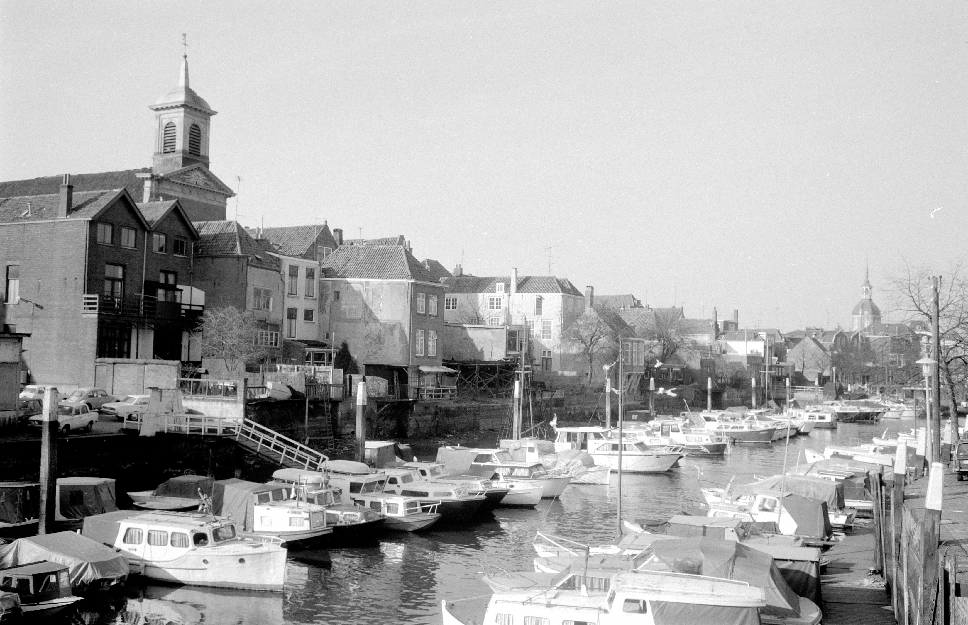 - De achterkant van huizen in de Wijnstraat langs de Wijnhaven vanaf de Nieuwbrug naar het noorden. Links de Bonifatiuskerk, rechts de Groothoofdspoort.