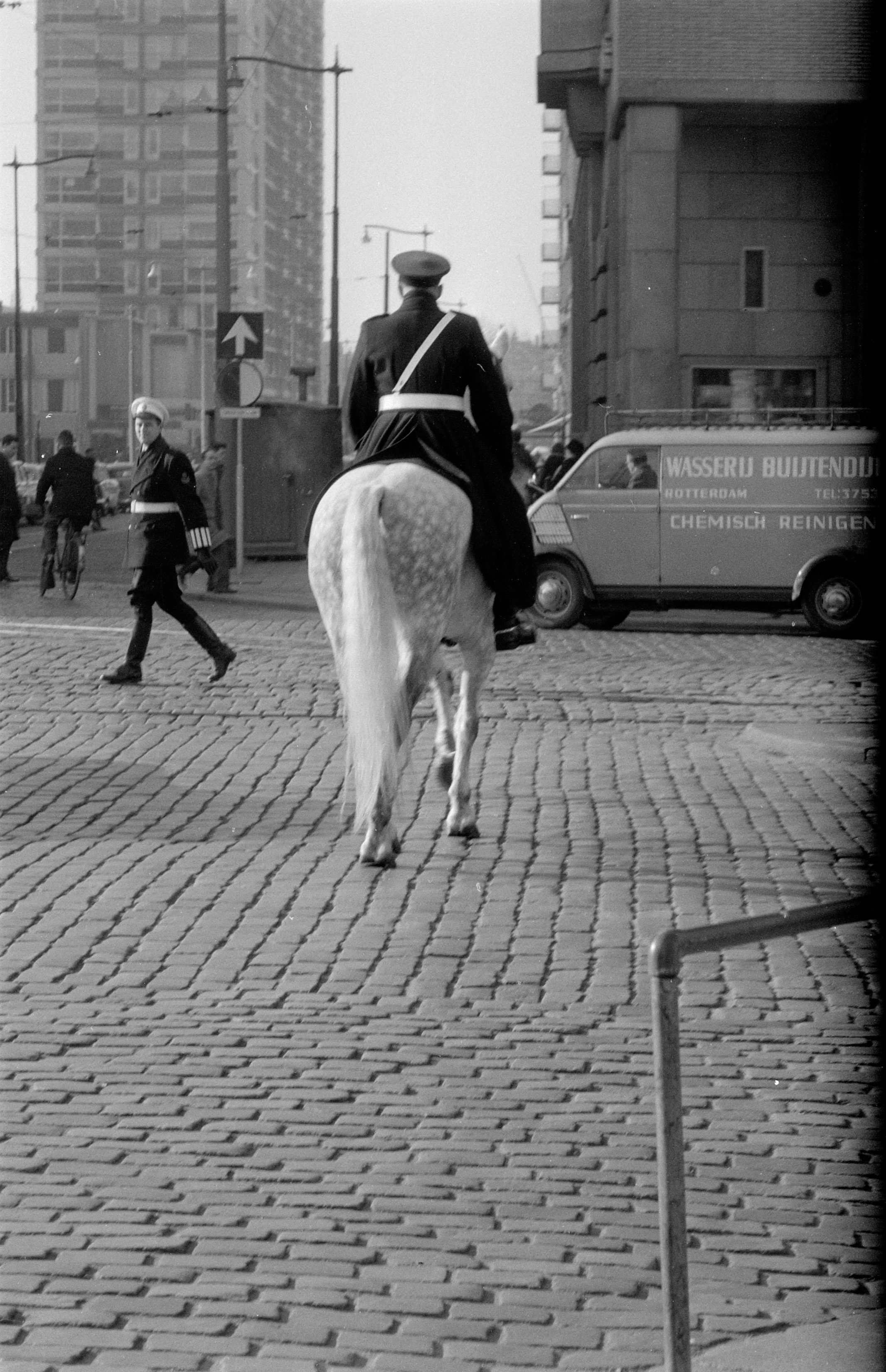 Politie te paard op de Coolsingel in Rotterdam. In het midden de Aert van Nesstraat met de Lijnbaanflat.