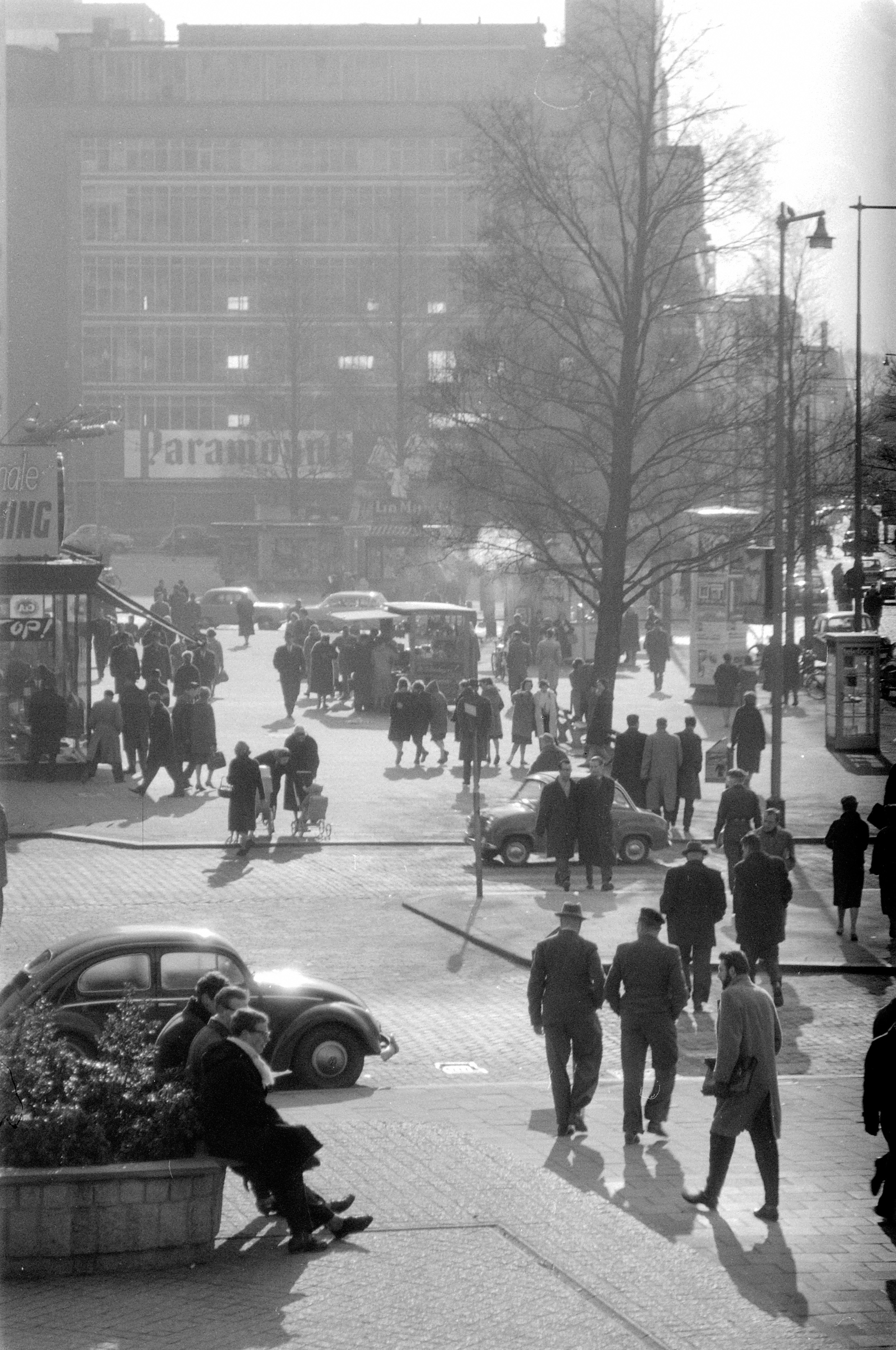 - auto's kiosken lantaarns / straatverlichting peperbussen / reclamezuilen telefooncellen voetgangers warenhuizen