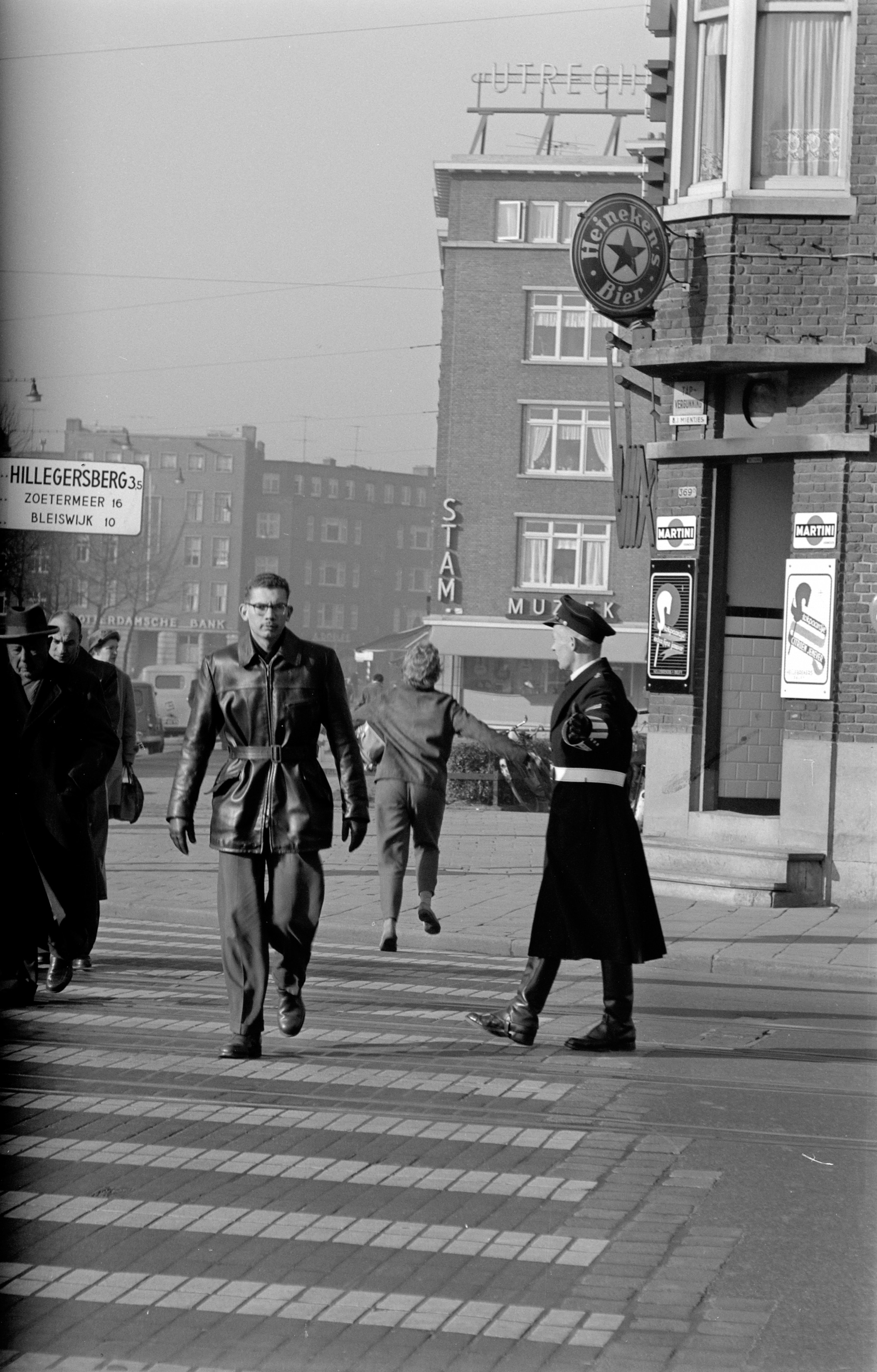 - Verkeersagent bij een oversteekplaats op de Bergweg in Rotterdam. Op de achtergrond muziekhandel Stam en de Schieweg.