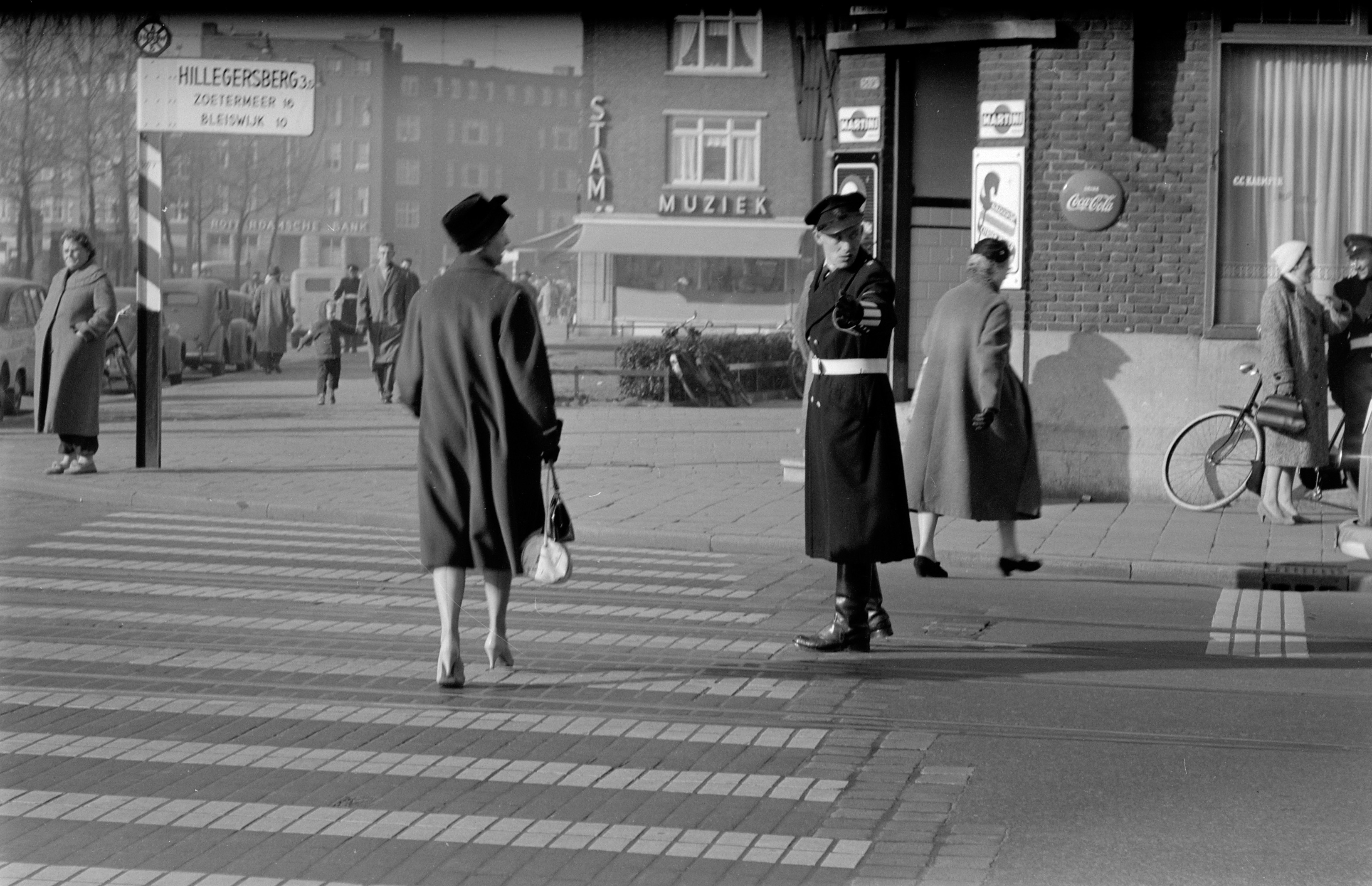 - Verkeersagent bij een oversteekplaats op de Bergweg in Rotterdam. Op de achtergrond muziekhandel Stam en de Schieweg.