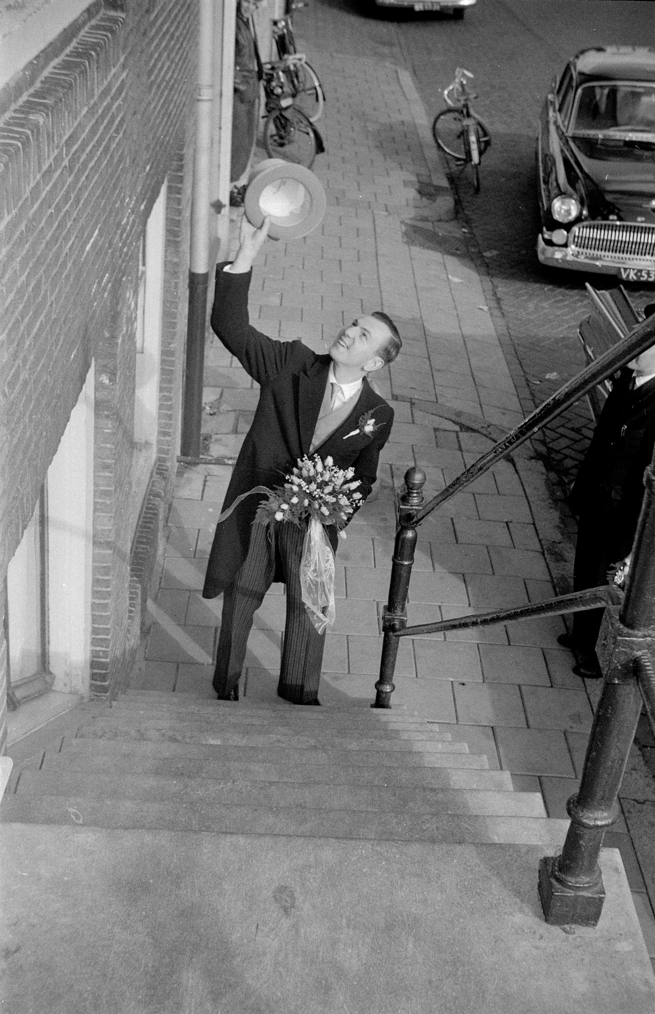 Om die foto's een correcte datum mee te geven zou het fijn zijn wanneer iemand de exacte huwelijksdatum zou kunnen vermelden. Zelf denk ik aan 7 april 1954, omdat dit de datum is dat Ego verhuisde naar Nieuwe Haven 14. --------------------------------------------------------------------------------------------------------------------------------------------------------------- In de collectie van Beket zit nog een andere serie betreffende een huwelijksfotoreportage, n.l. 947_2192 t/m 947_2236. Het speelt zich o.a. af rond de RK kerk aan de brouwersdijk en een flat aan de Anna van Burenstraat 42. Het zal zo eind '60 - begin '70 zijn. Op dit adres woont Jantje Ritskes samen met haar man Willem van der Linden. Jantje Ritskes is de zus van Ego's vrouw, Henny Ritskes. Logisch dus dat Ego daar wat foto's schiet. Het betreft niet het huwelijk van Willem en Jantje, want zij waren in 1949 reeds getrouwd en die flats dateren van '53/'54. Vanaf hun huwelijk woonden zij eerst in de Jacob Marisstraat 44zw om pas in oktober '54 naar de Anna van Burenstraat 42 te verhuizen. Ze hebben daar tot 1april 1964 gewoond. Het is me dus volledig onduidelijk wel bruidspaar vanuit de woning van Willem en Jantje die bewuste dag in het huwelijksbootje stapte.