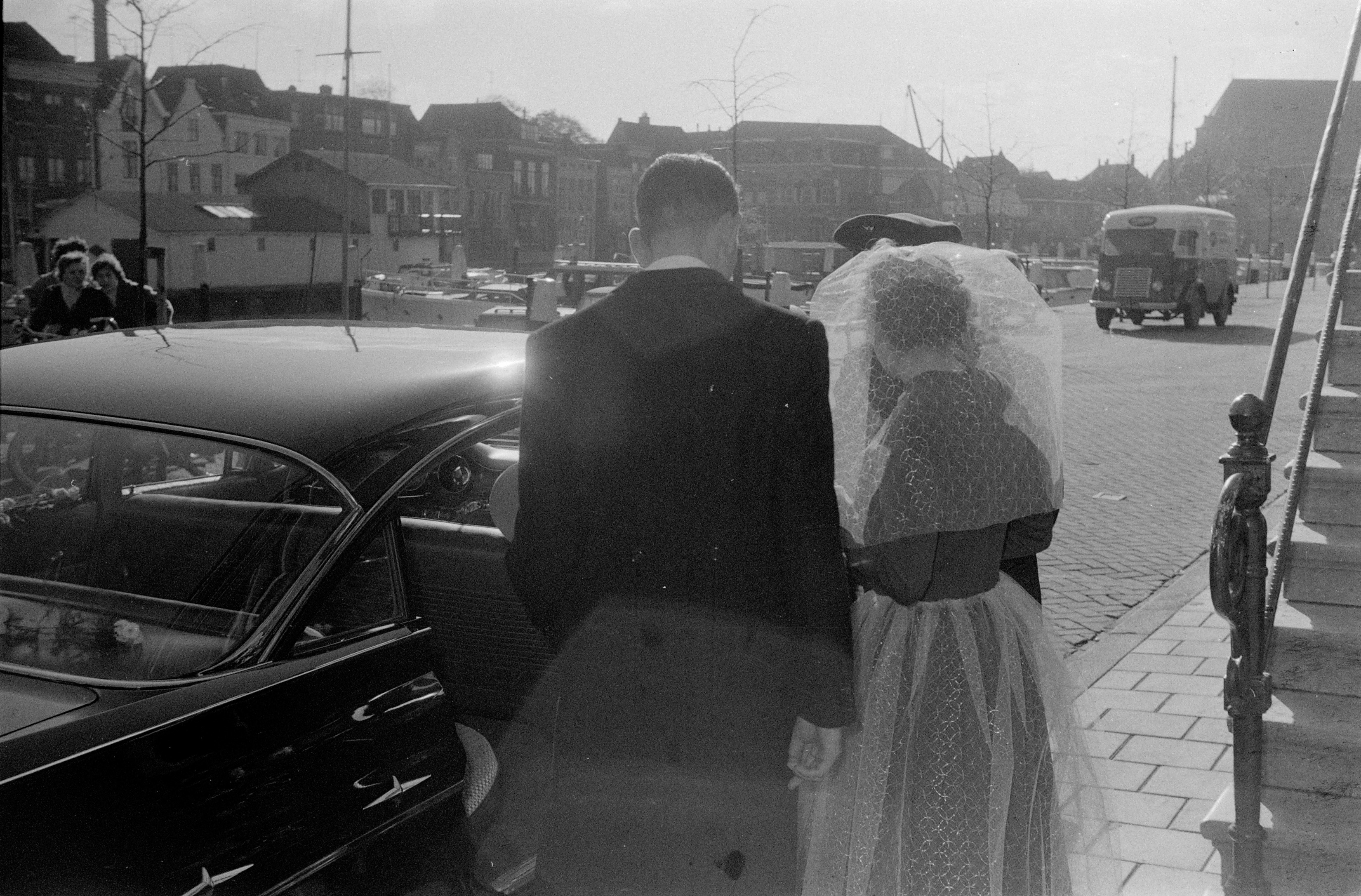- Bruidspaar Henny Ritskes en Ego Beket op de Nieuwe Haven. Links het botenhuis van de roei- en zeilvereniging aan de Knolhaven, meer naar rechts de Houttuinen.