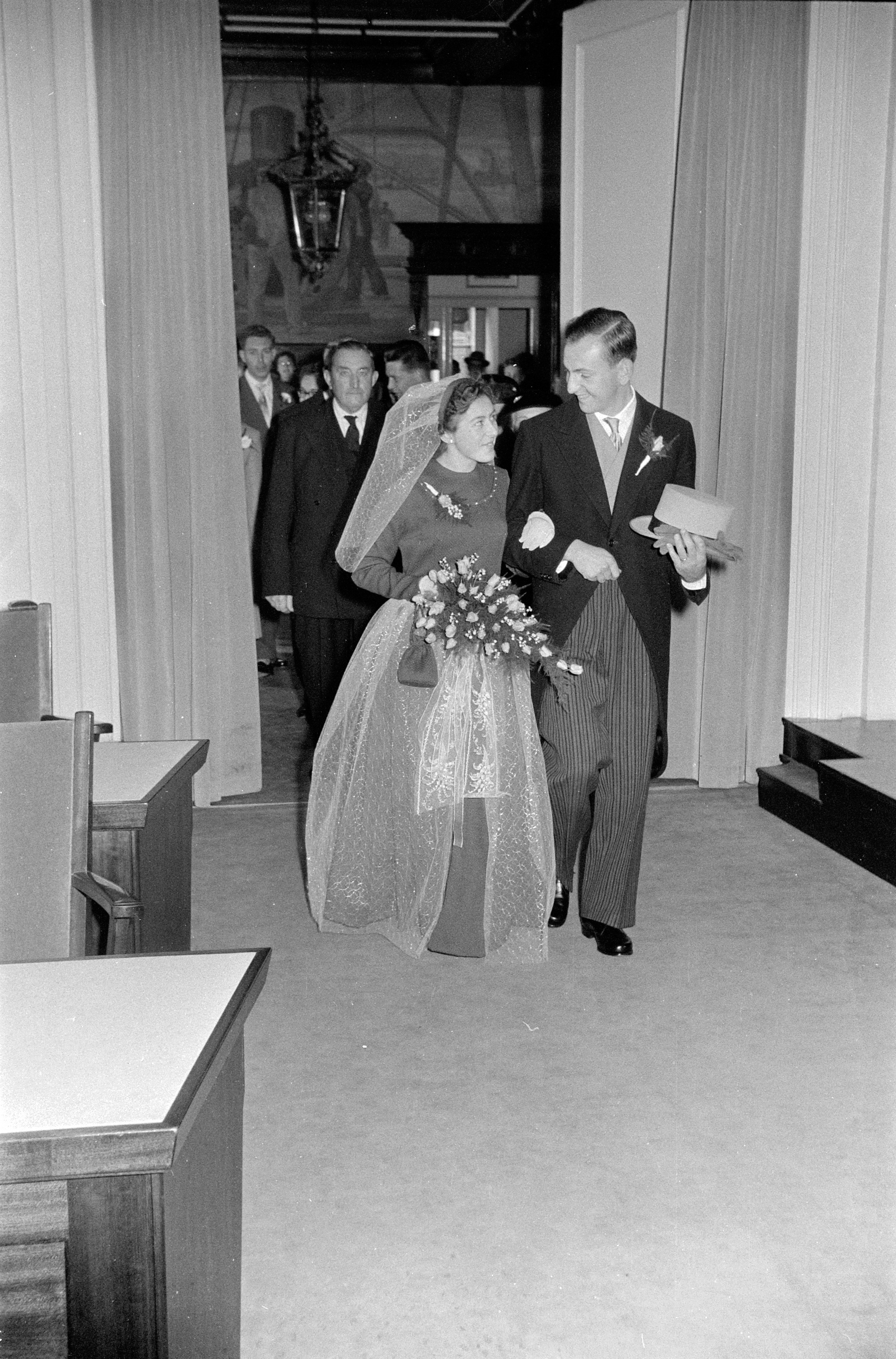 - Een bruidspaar arriveert in de trouwzaal van het stadhuis.