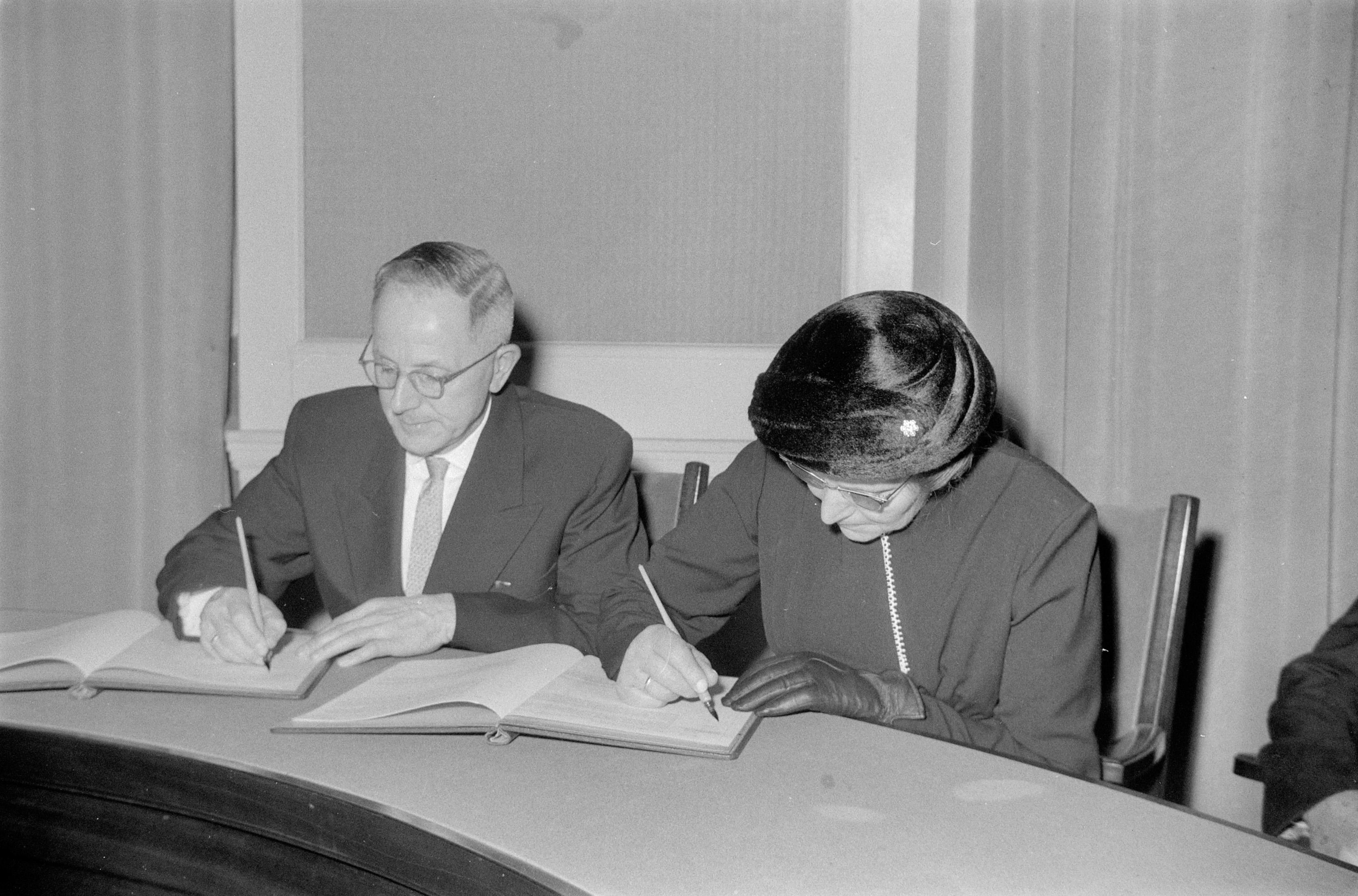 - Getuigen tekenen de huwelijksakte van Ego Beket en Henny Ritskes in de trouwzaal van het stadhuis.