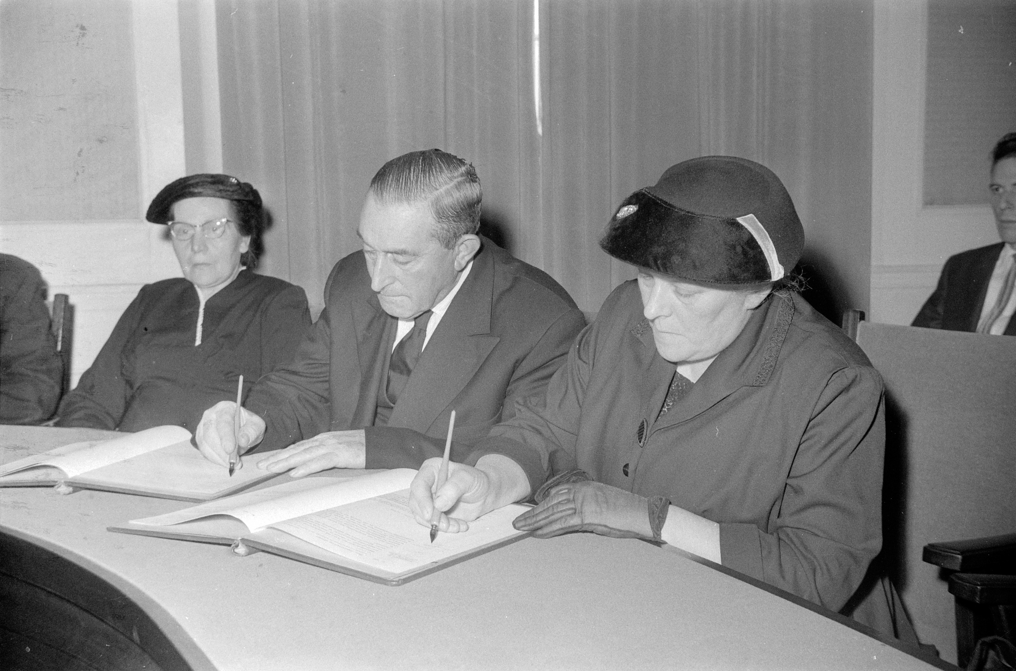 - Getuigen tekenen de huwelijksakte van Ego Beket en Henny Ritskes in de trouwzaal van het stadhuis.