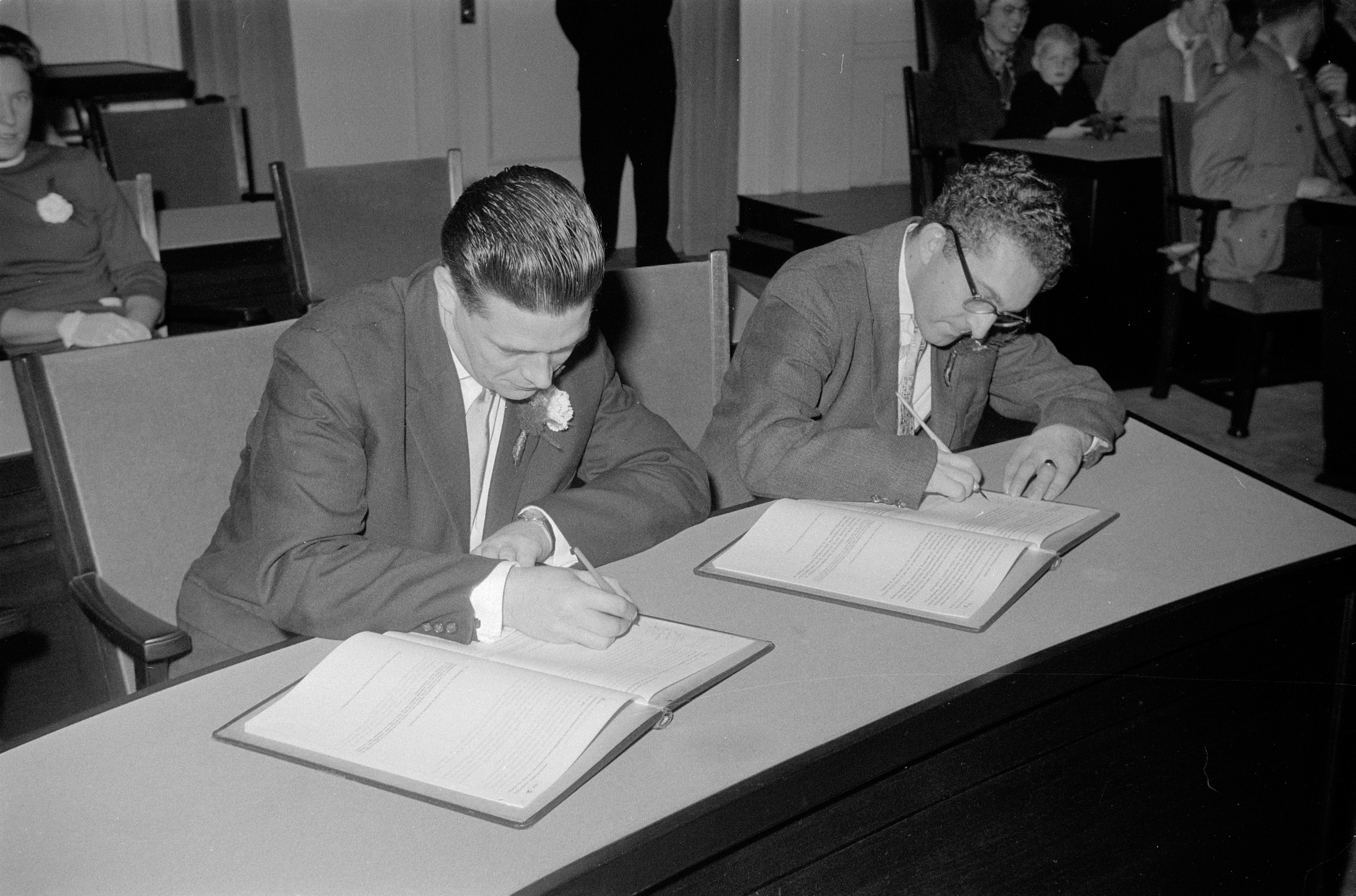- Getuigen tekenen de huwelijksakte van Ego Beket en Henny Ritskes in de trouwzaal van het stadhuis.