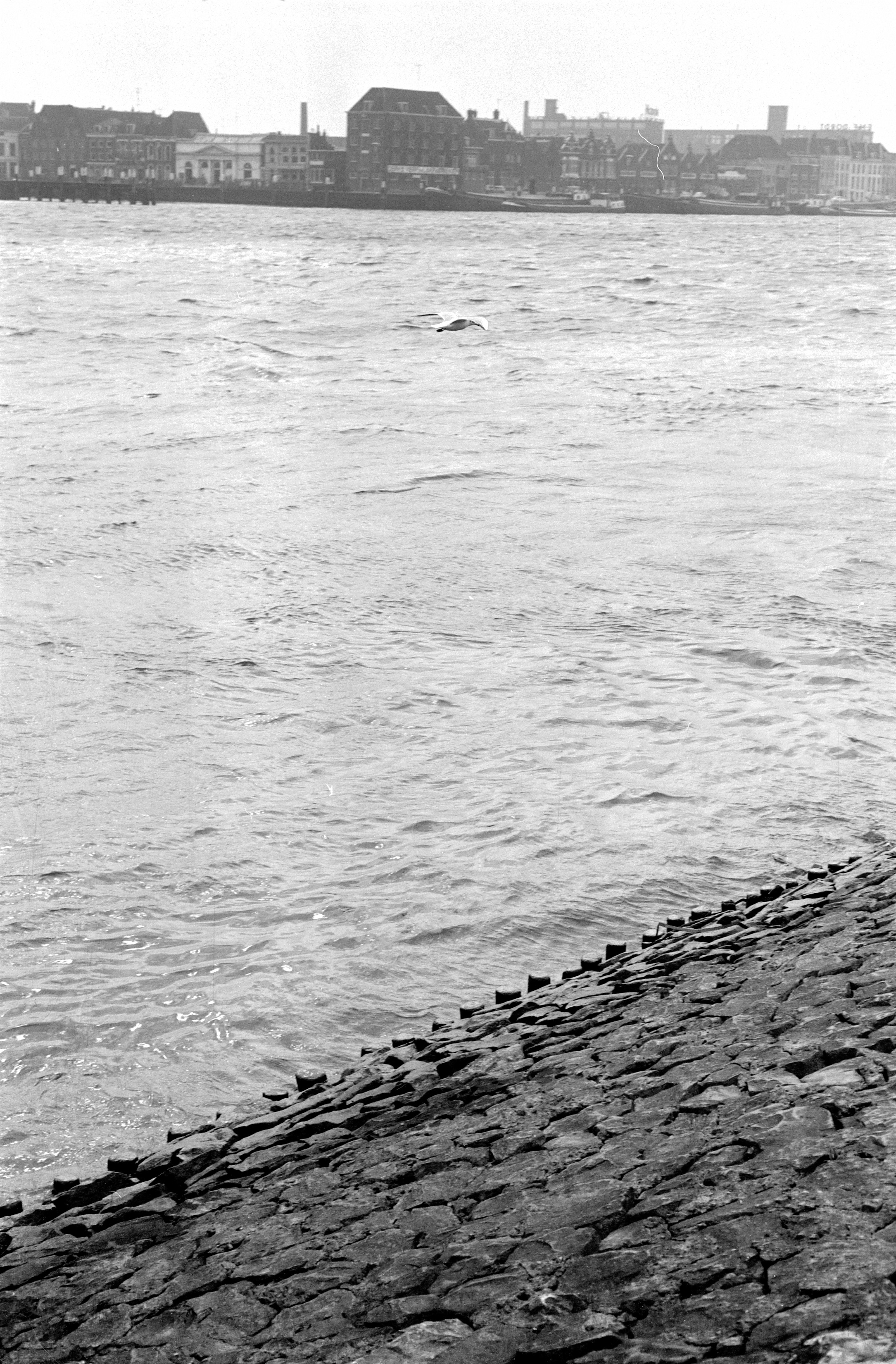 - Blik over de Oude Maas. Links de Bomkade met de Korenbeurs. Pakhuis Vredenburg op de hoek Bomkade/Buiten Kalkhaven. Rechts daarnaast de fabrieken Victoria en EMF.