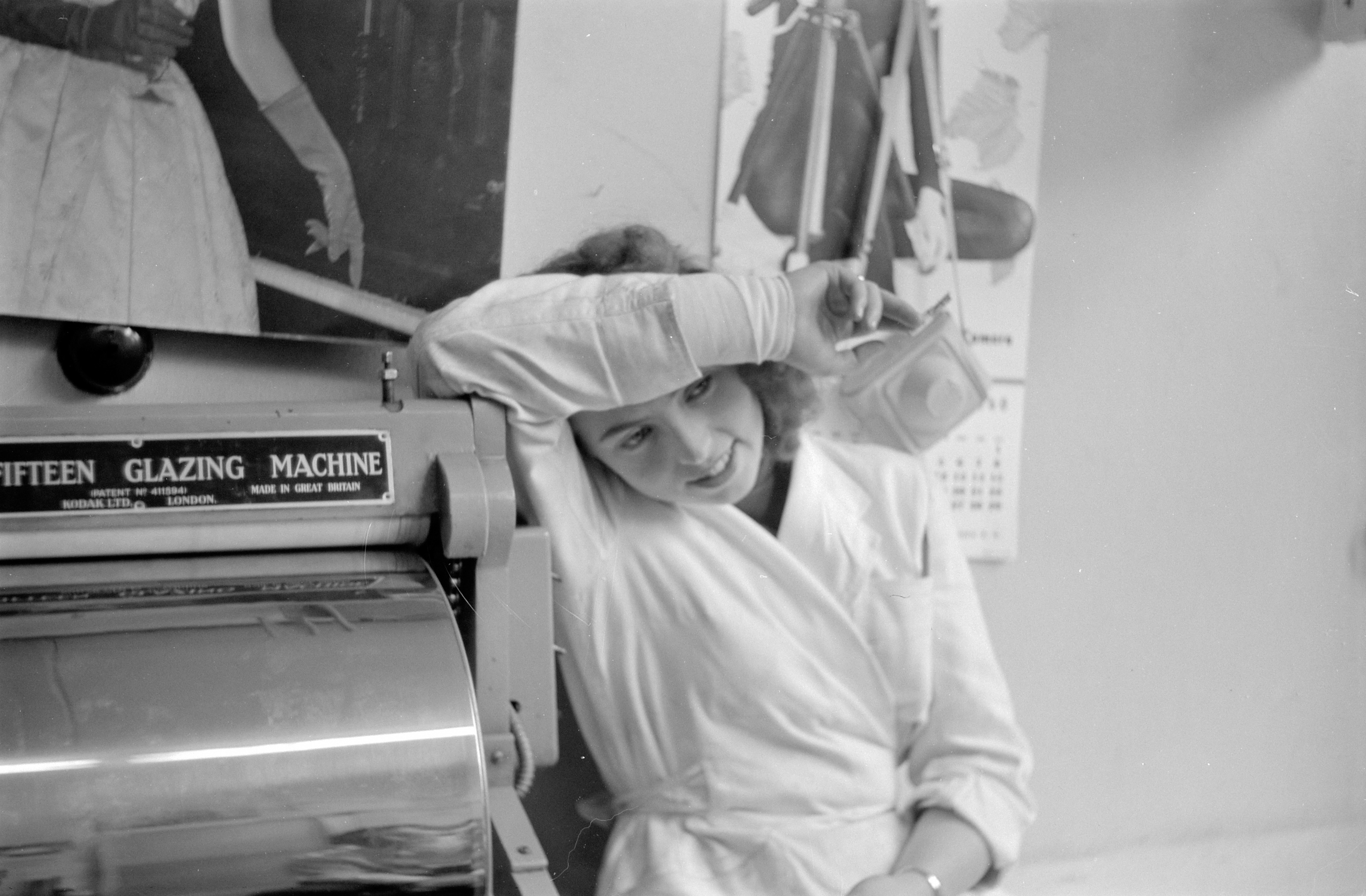 Bediende bij een apparaat voor het glanzen van foto's.