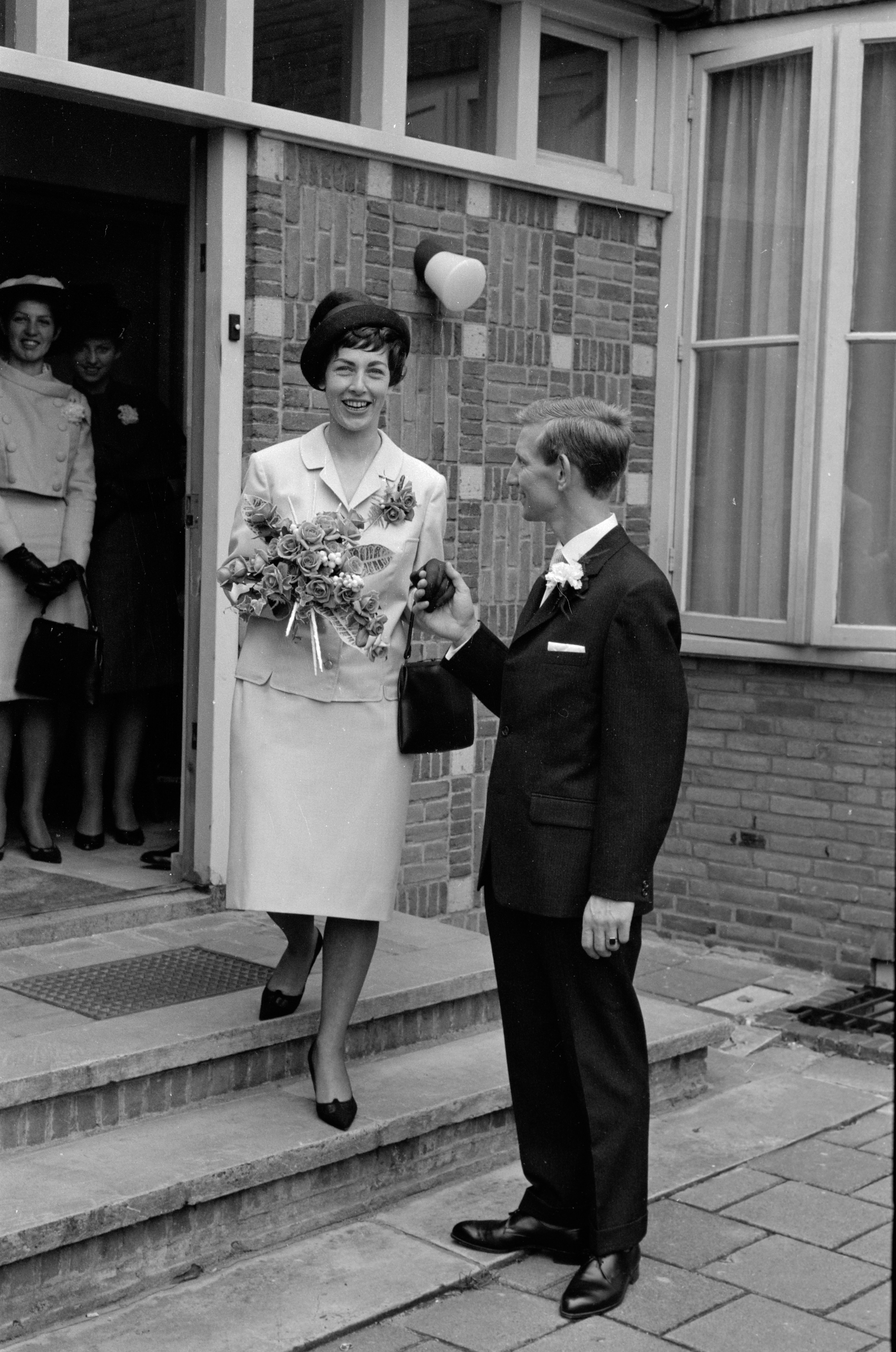 Het bruidspaar Henk Ritskes en Anne Marie Janssen bij de Onze Lieve Vrouwe Kerk op de hoek van de Brouwersdijk en de Frans Lebretlaan.