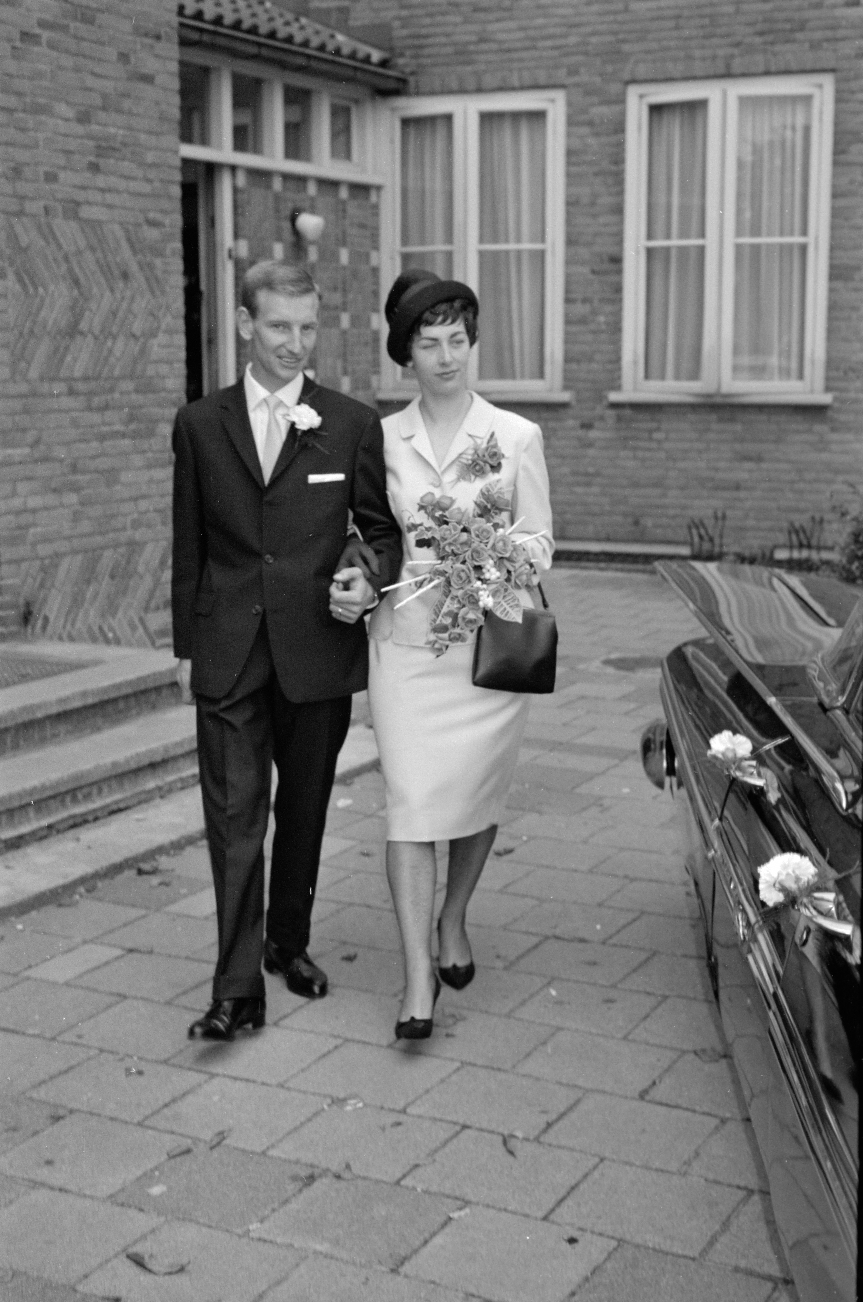 - Een bruidspaar bij de Onze Lieve Vrouwe Kerk op de hoek van de Brouwersdijk en de Frans Lebretlaan.