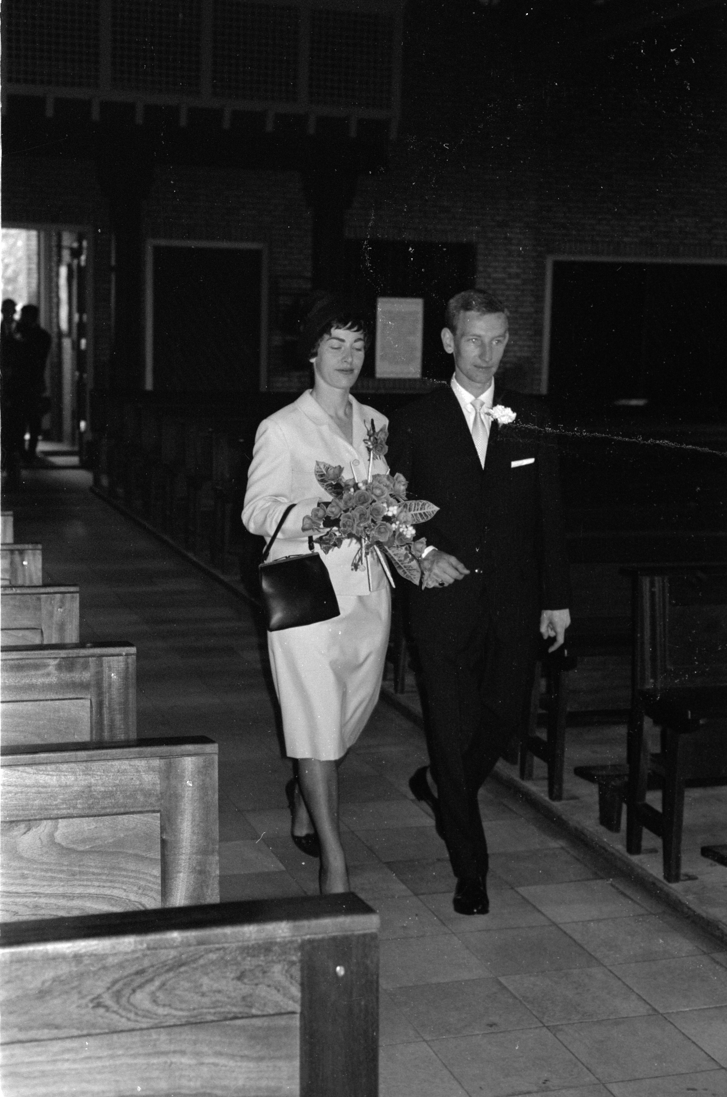 - Een bruidspaar in de Onze Lieve Vrouwe Kerk op de hoek van de Brouwersdijk en de Frans Lebretlaan.