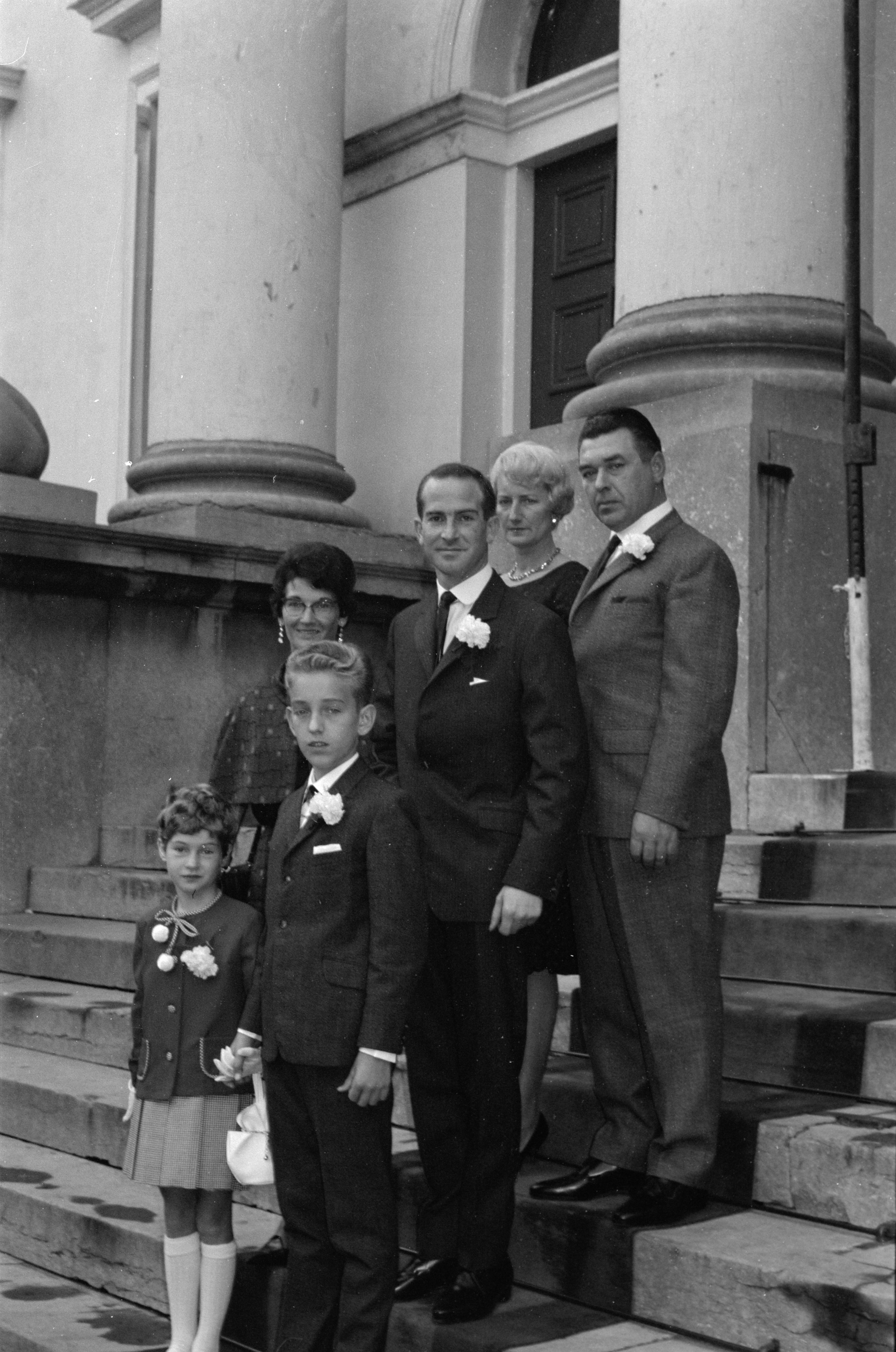 Familie van een bruidspaar op de trappen van het stadhuis.