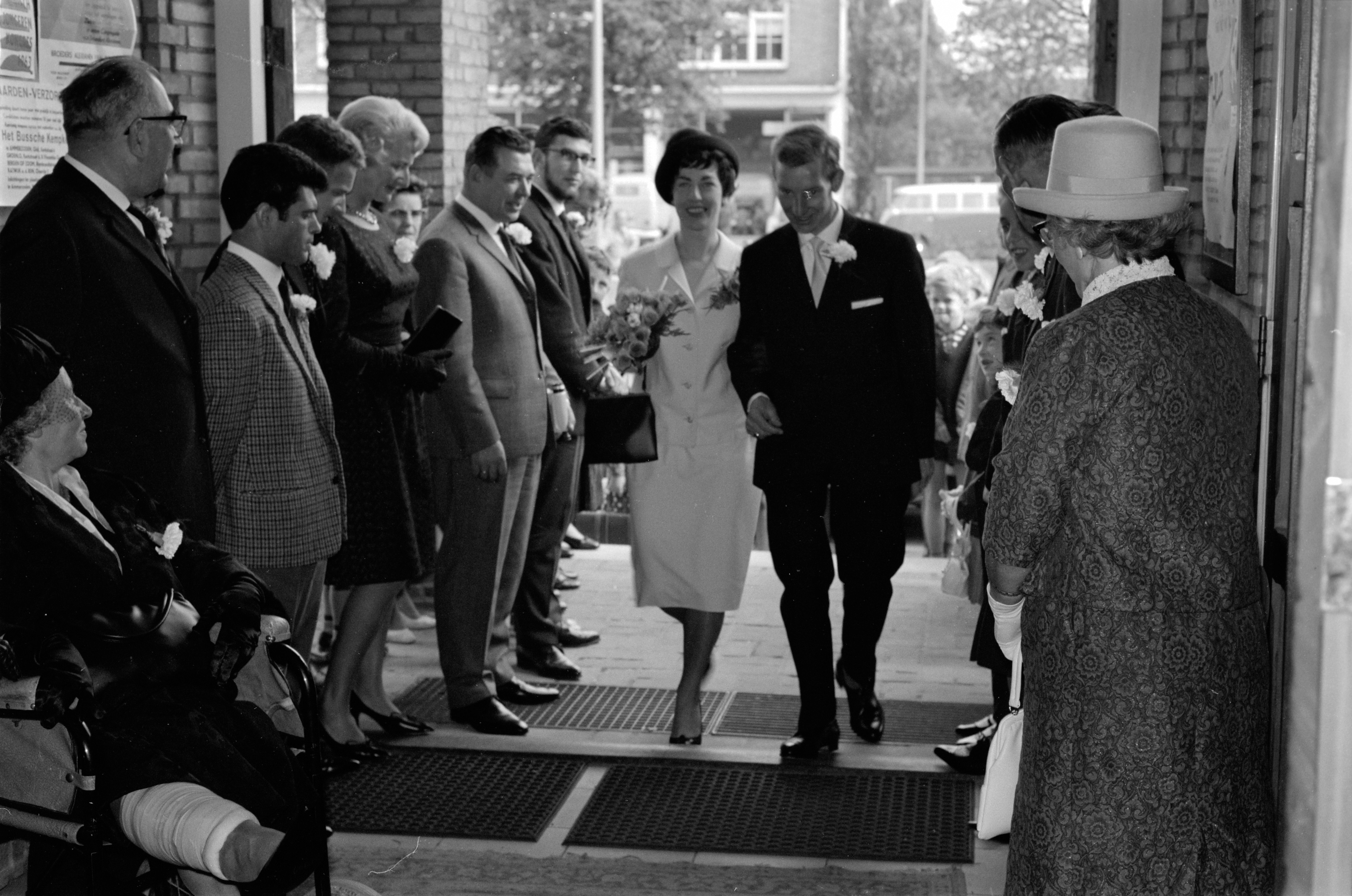 Een bruidspaar betreedt de Onze Lieve Vrouwe Kerk op de hoek van de Brouwersdijk en de Frans Lebretlaan.