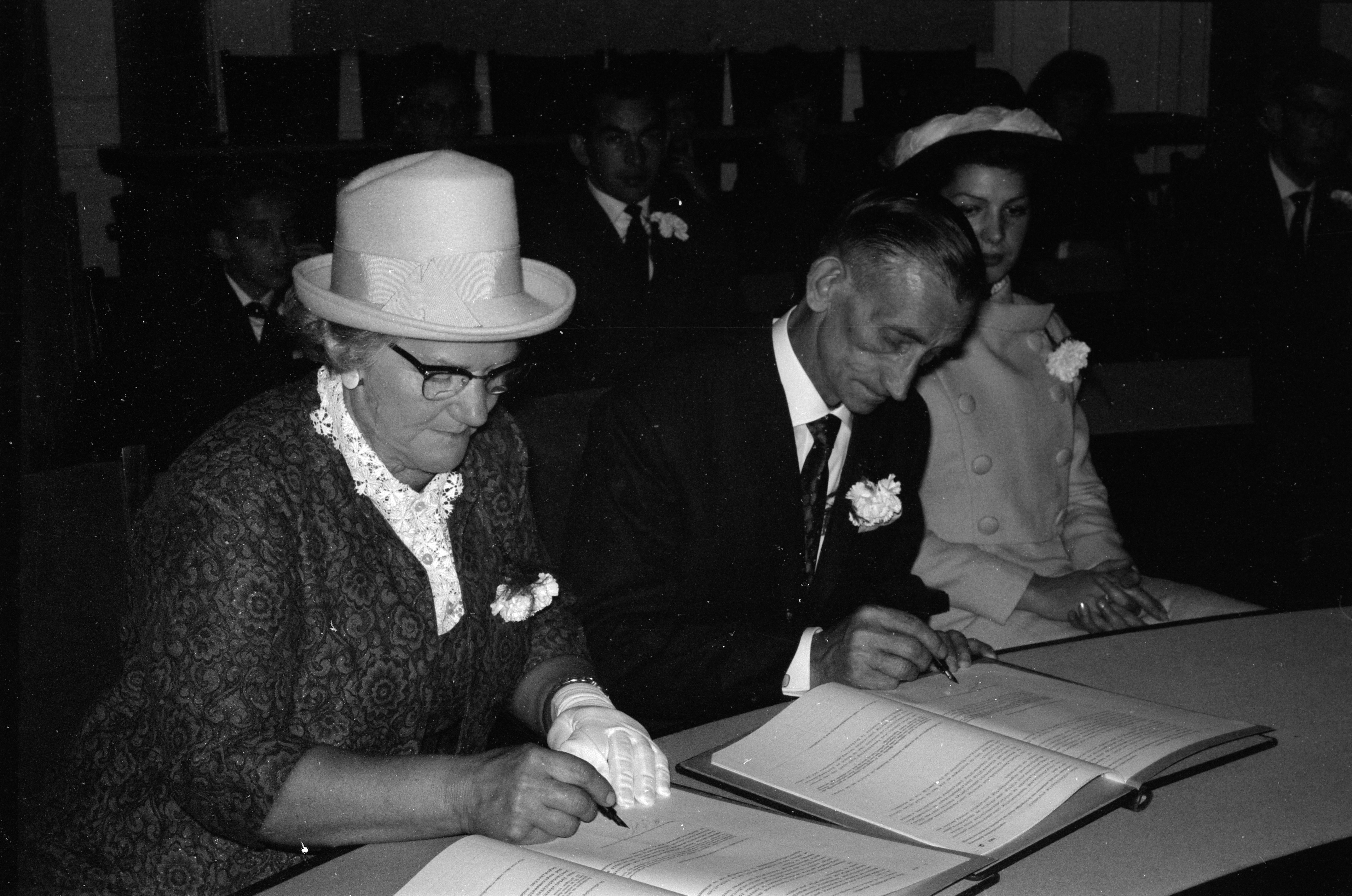 - Getuigen tekenen een huwelijksakte in de trouwzaal van het stadhuis.