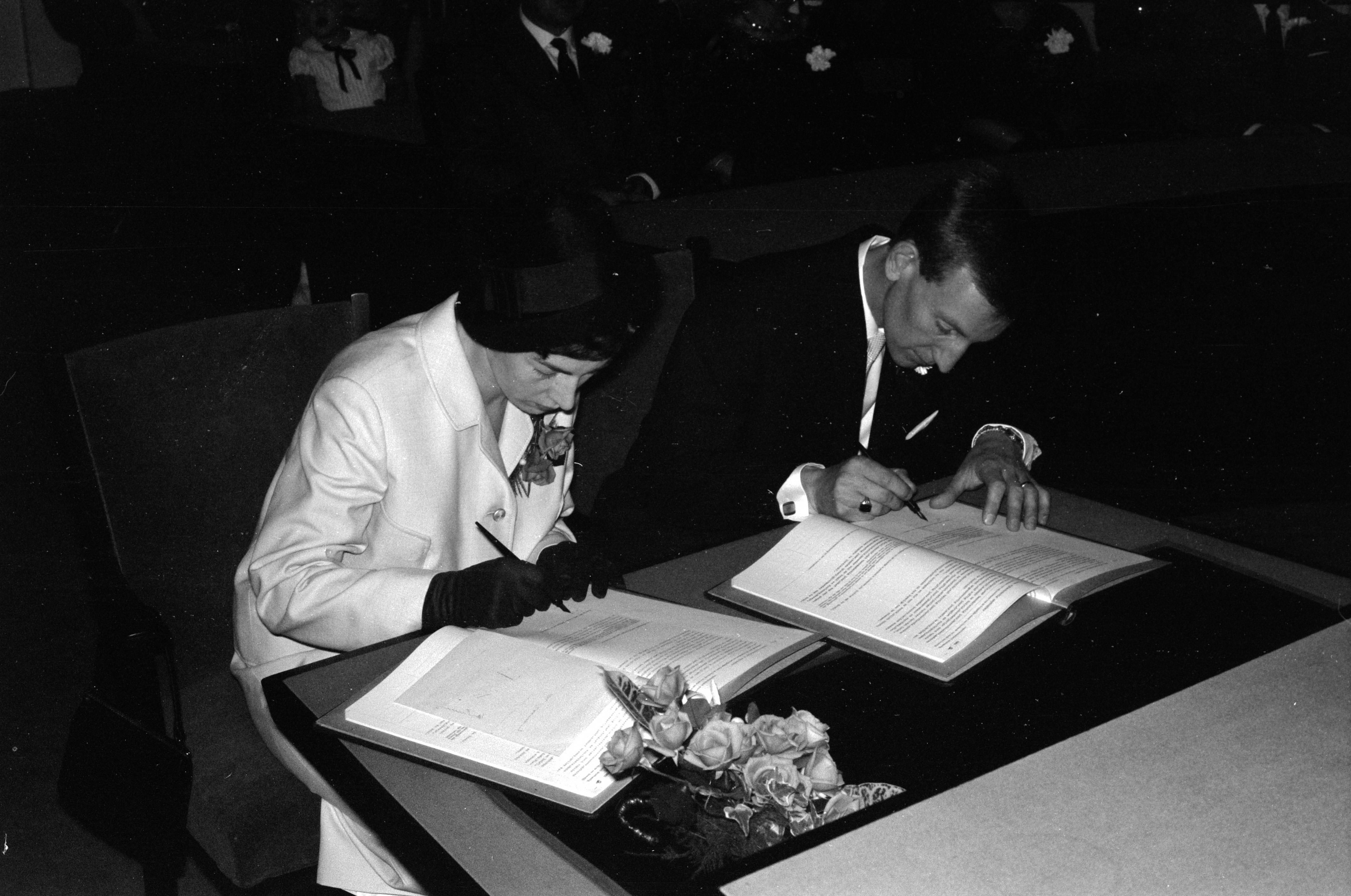 - Bruidspaar tekent de huwelijksakte in de trouwzaal van het stadhuis.