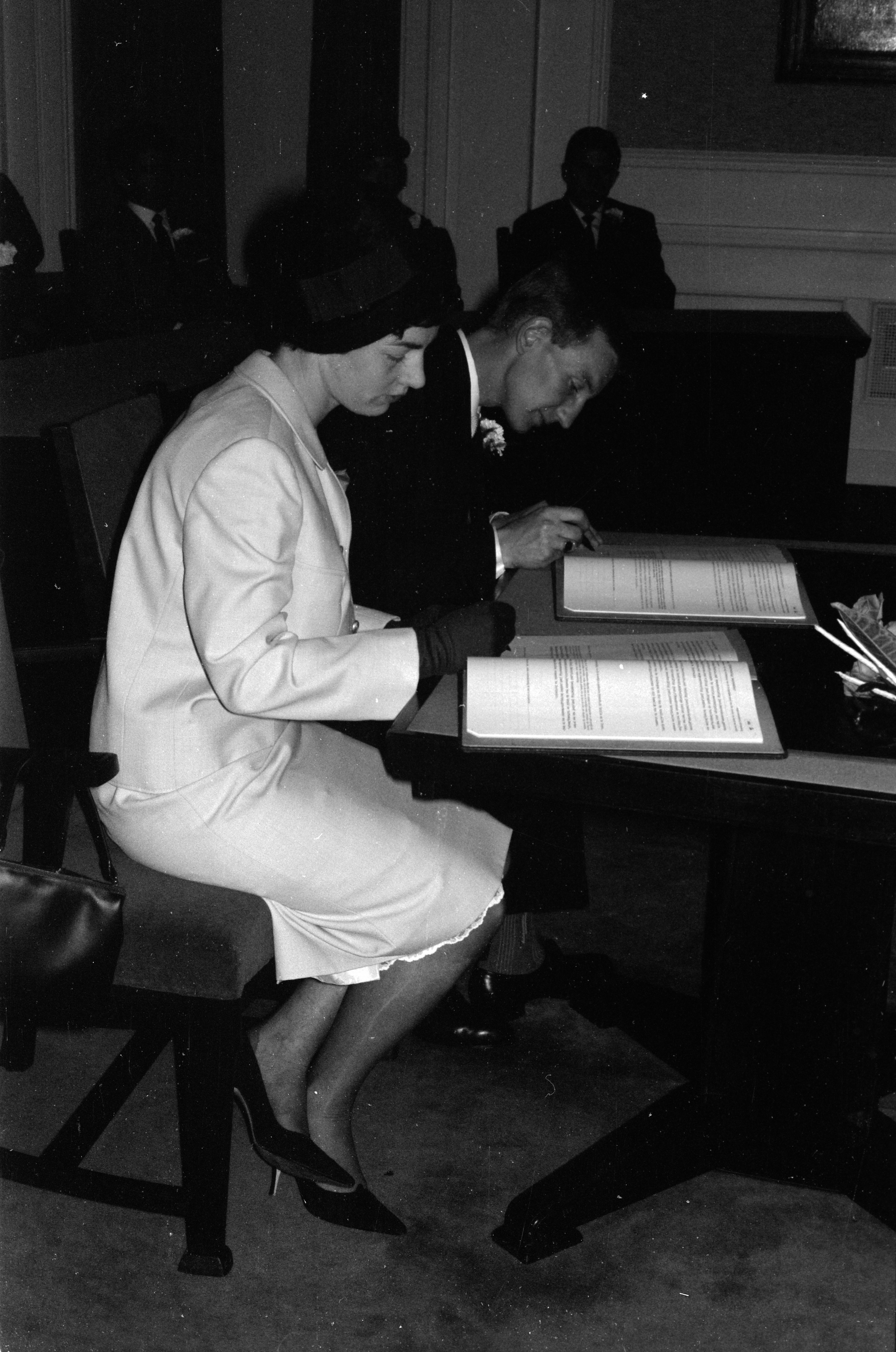 Bruidspaar tekent de huwelijksakte in de trouwzaal van het stadhuis.