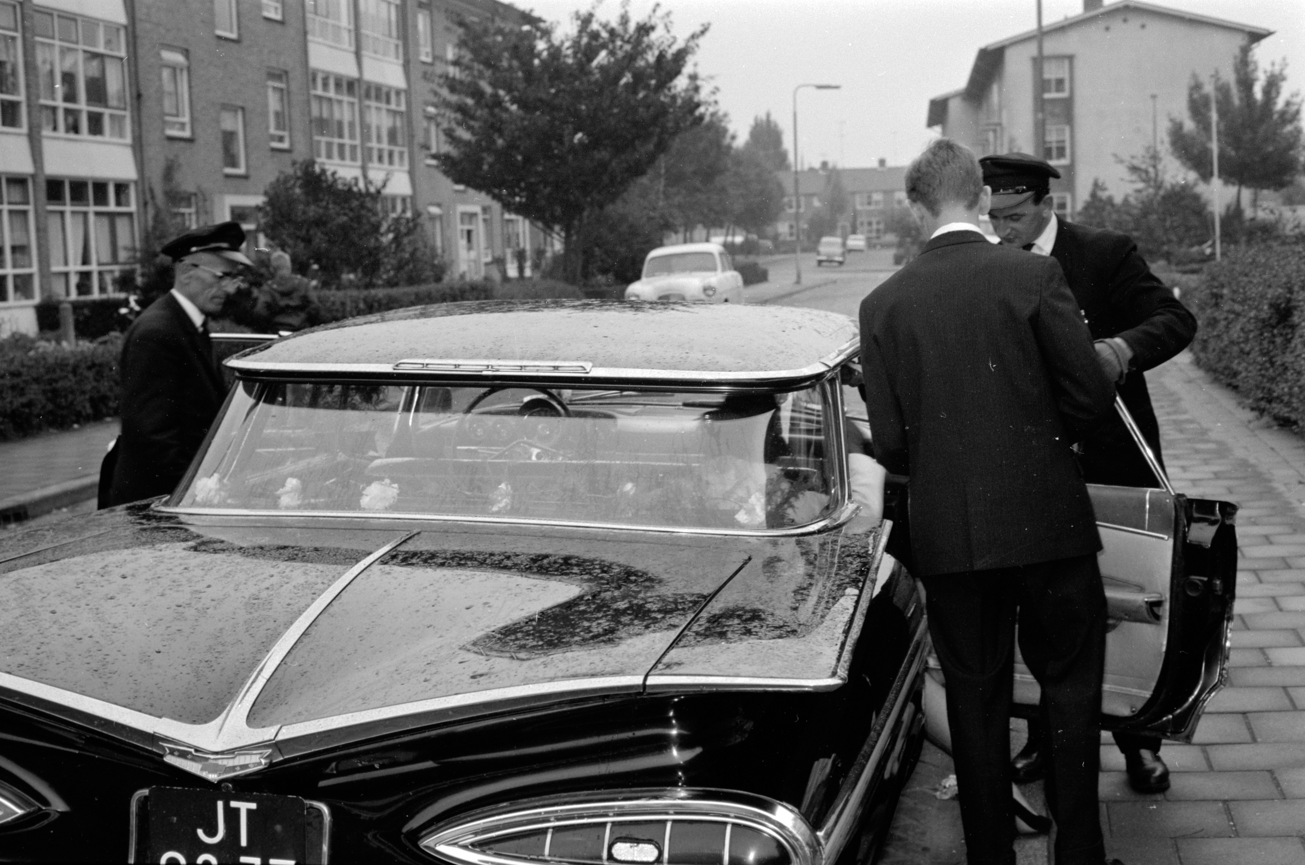 - Trouwauto voor het ophalen van de bruid in de Anna van Burenstraat, gezien richting Waldeck Pyrmondweg.