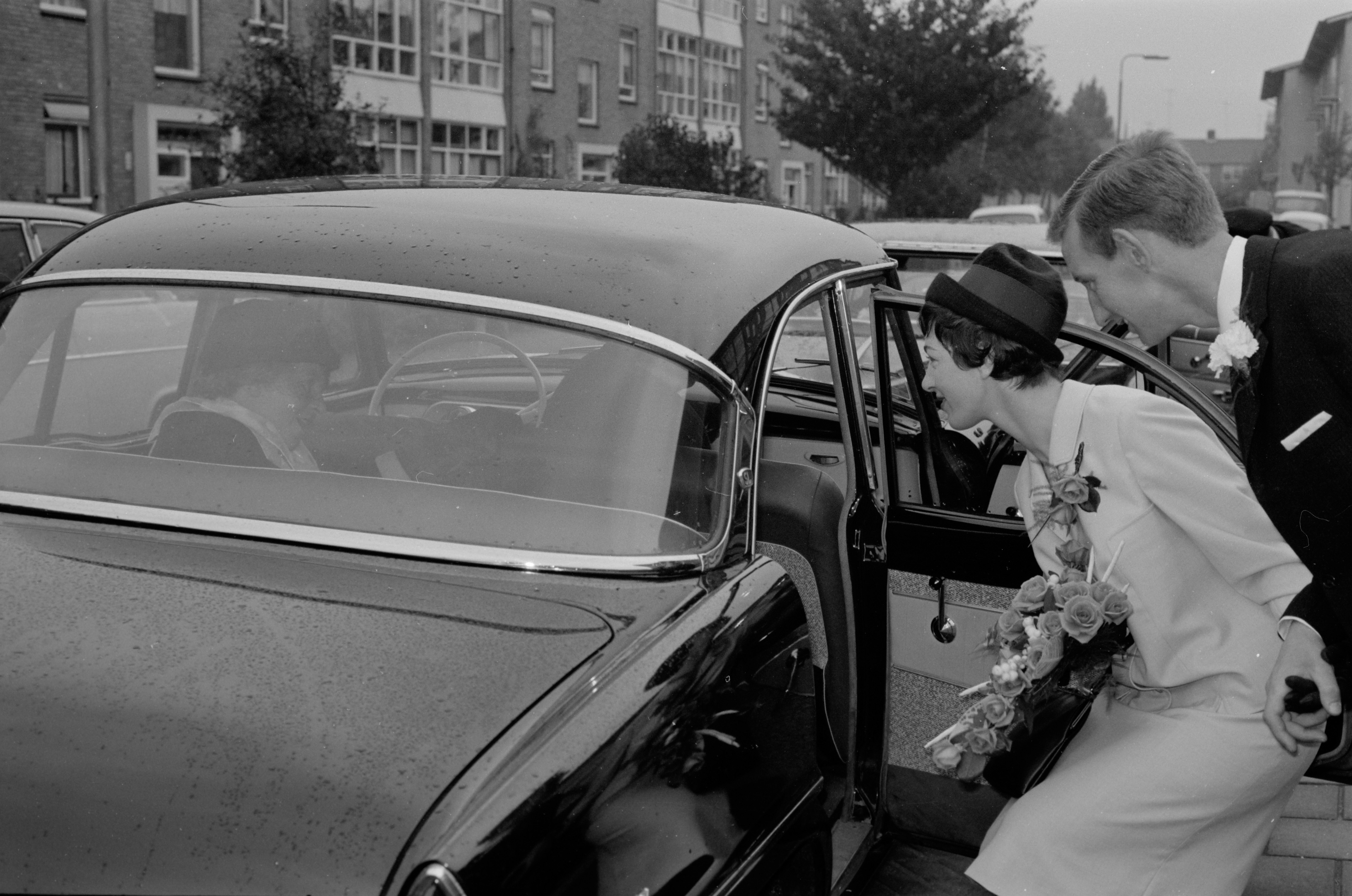 Trouwauto voor het ophalen van de bruid in de Anna van Burenstraat, gezien richting …