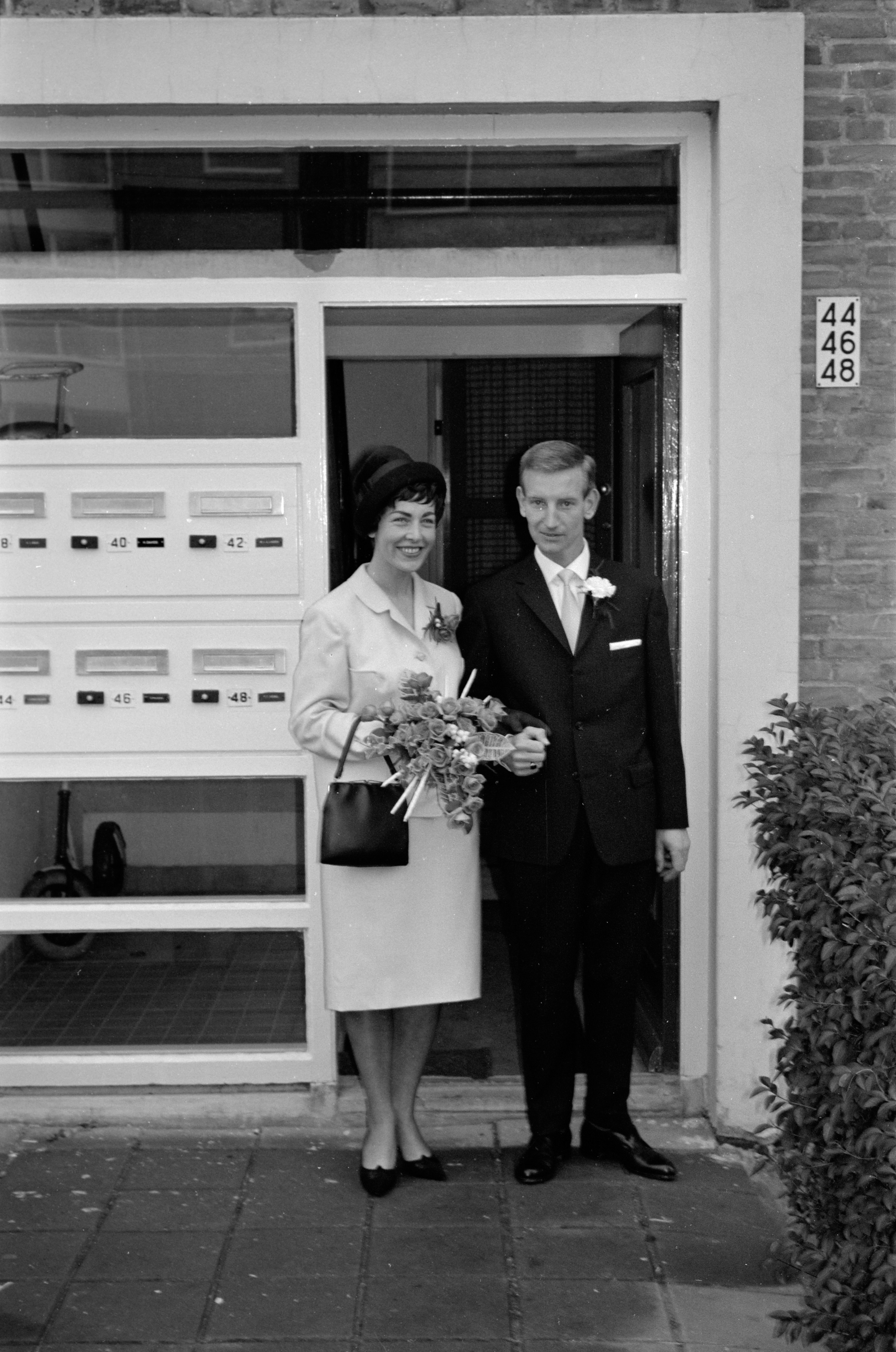 Bruidspaar bij de woning van de bruid in de Anna van Burenstraat.