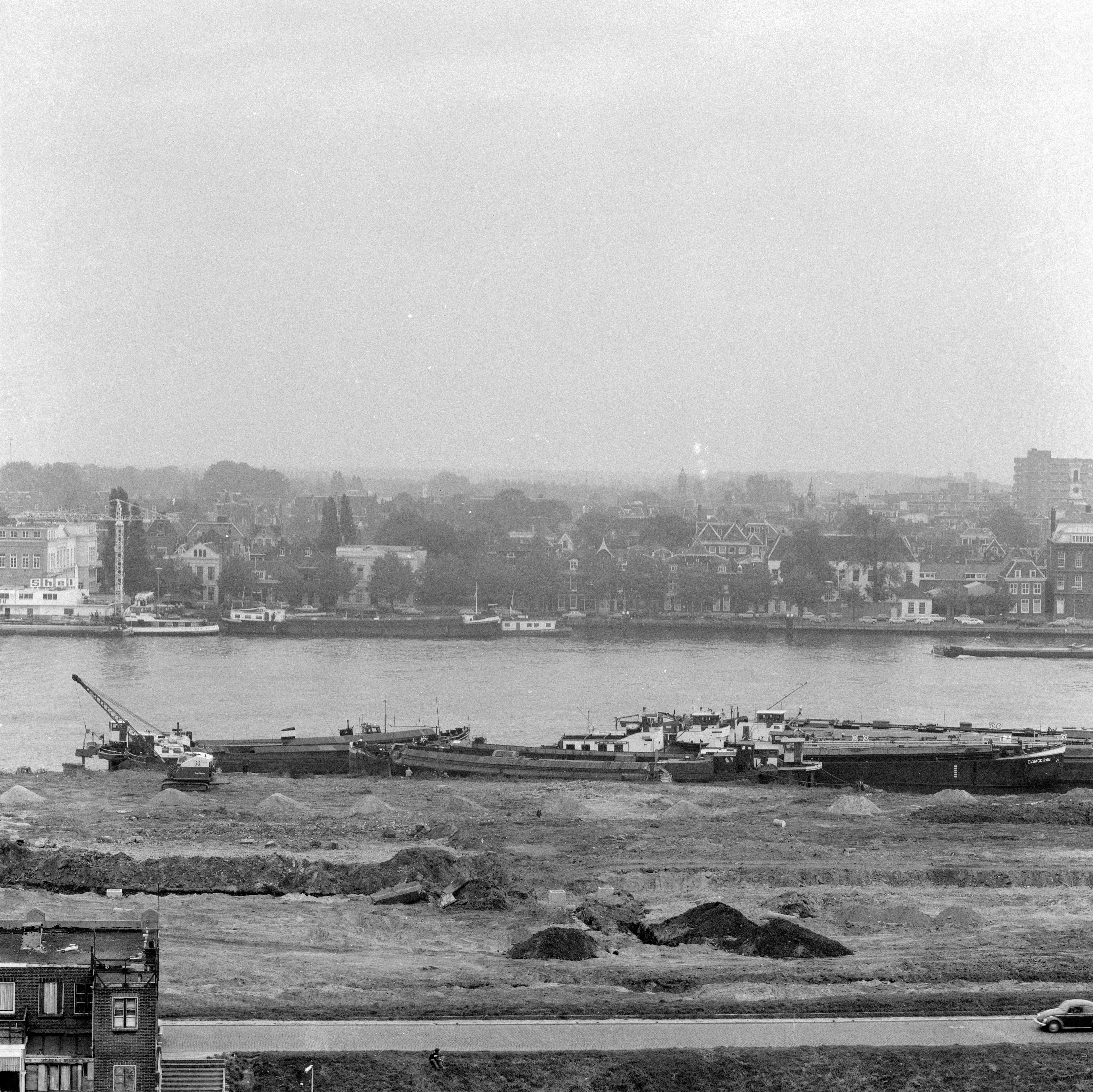 Panorama vanuit Zwijndrecht over de Ringdijk en de Oude Maas op de Buiten Walevest. Links de gemeentelijke kweekschool aan de Veersteiger, rechts de pontonnierskazerne.