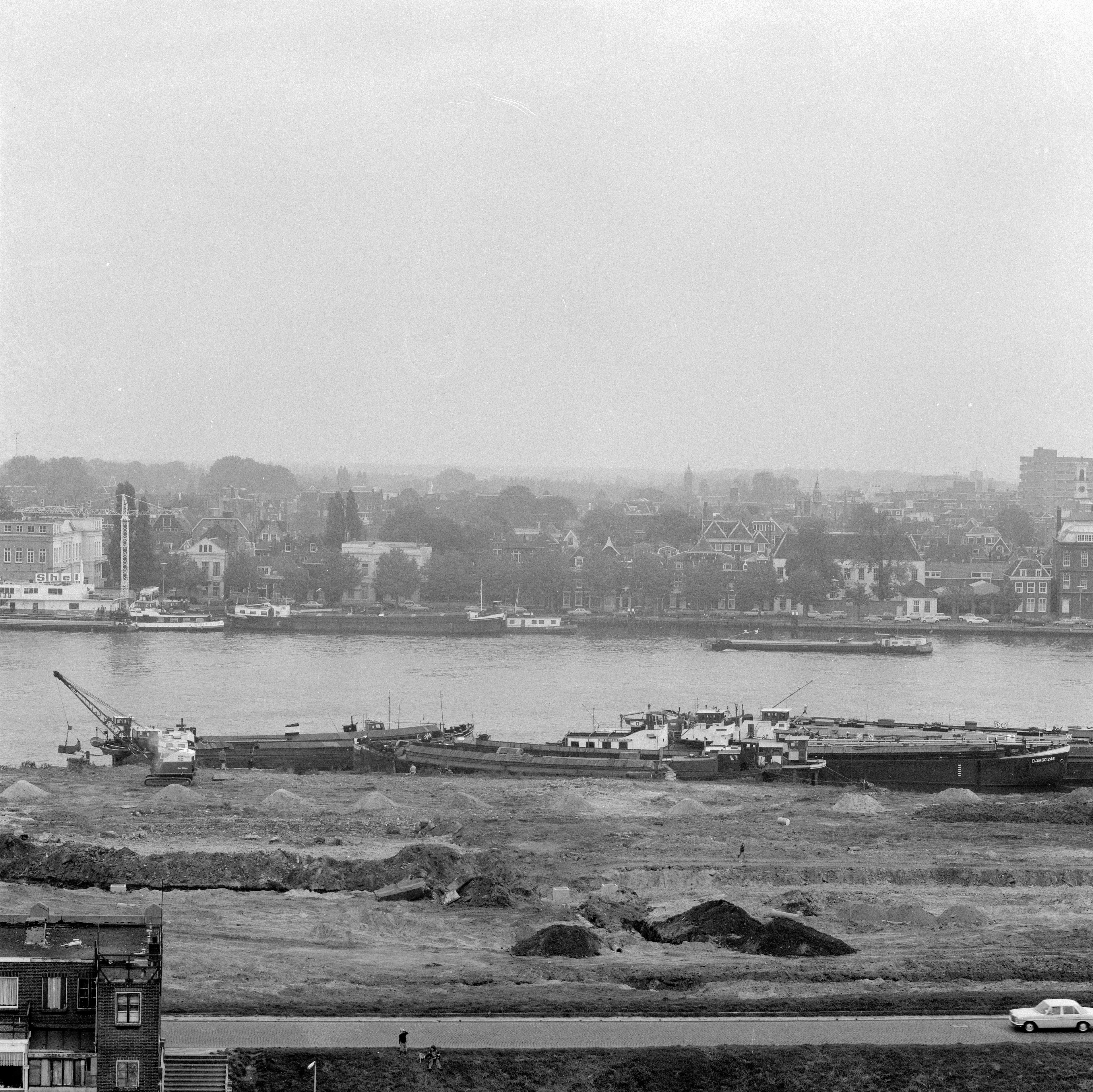 - Panorama vanuit Zwijndrecht over de Ringdijk en de Oude Maas op de Buiten Walevest. Links de gemeentelijke kweekschool aan de Veersteiger, rechts de pontonnierskazerne.