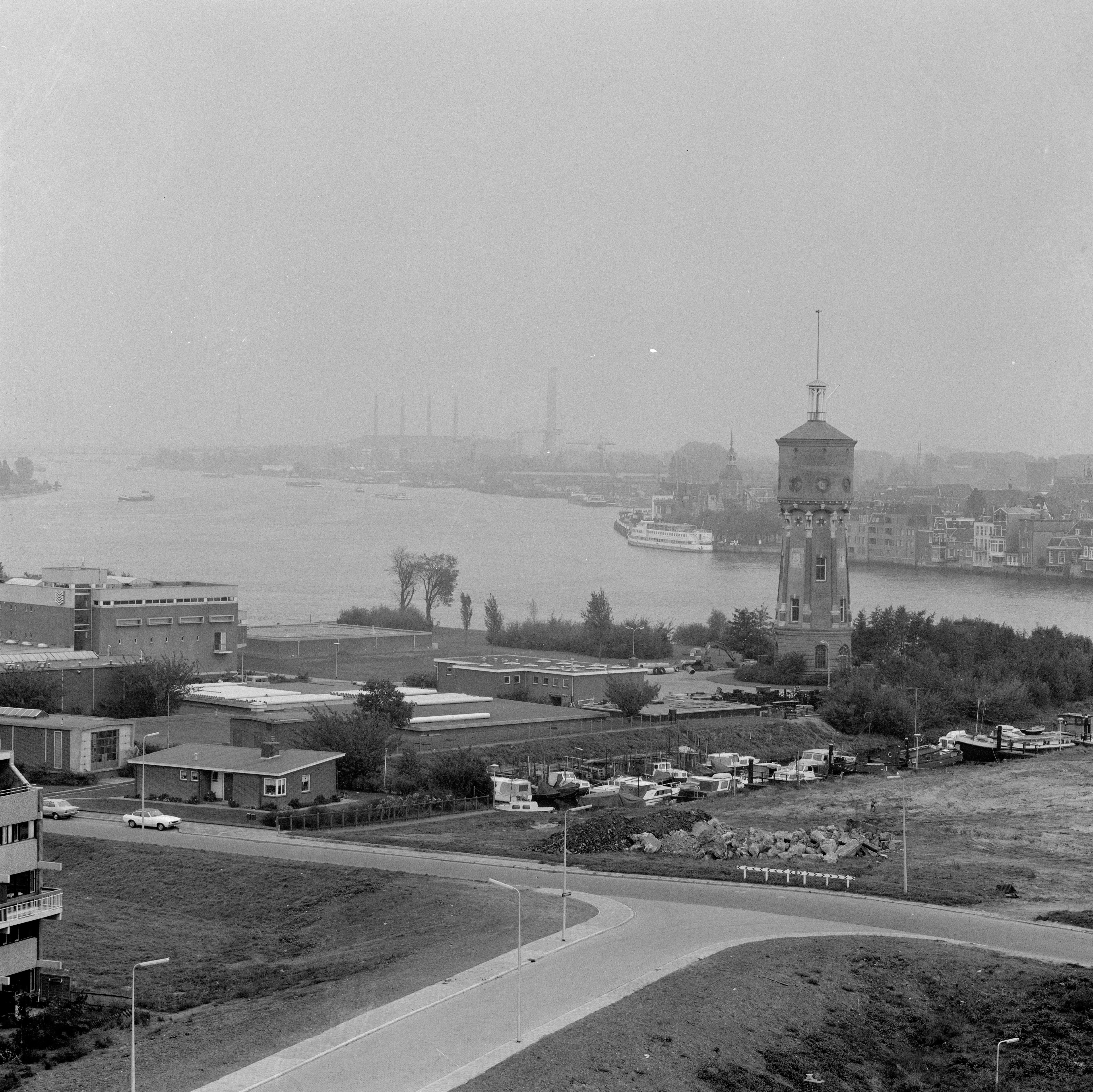 - Panorama vanuit Zwijndrecht over de Noord, Merwede en Oude Maas naar Dordrecht. Op de voorgrond de Ringdijk. Links van de watertoren de Groothoofdspoort en rechts de Wolwevershaven. Aan de horizon is de elektriciteitscentrale op de Staart zichtbaar.
